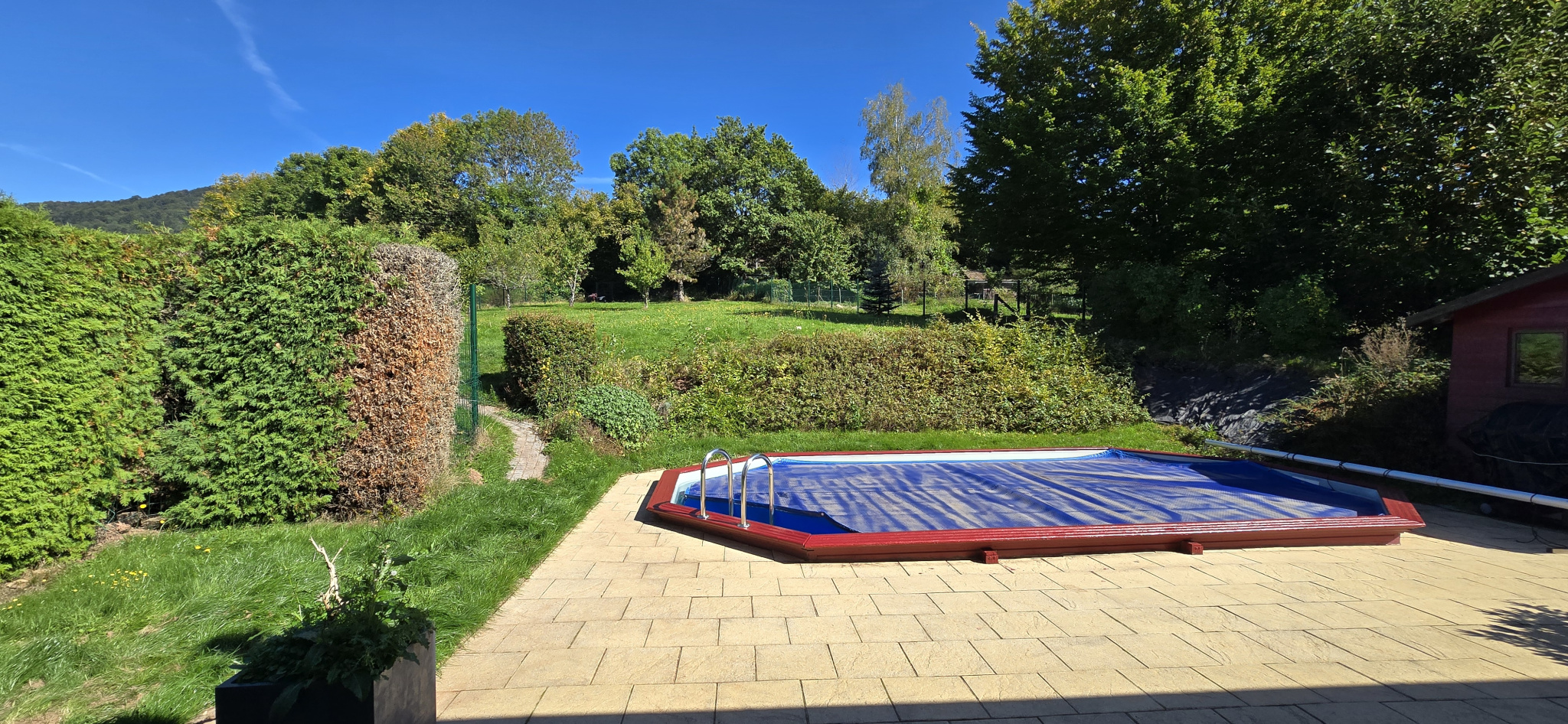 A l'extérieur : joli terrain entièrement clos et arboré, petit cabanon, piscine.