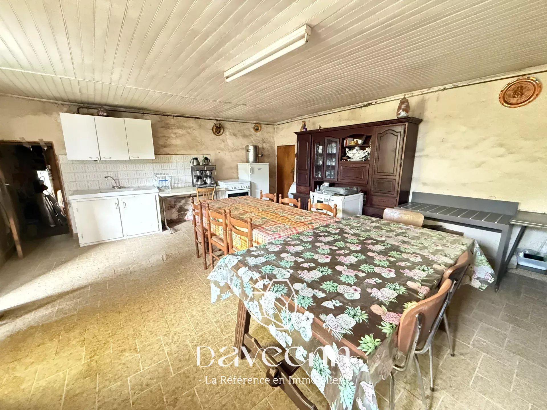 Il comprend au rez-de-chaussée une pièce de vie, 2 chambres, salle d’eau, WC, une pièce avec grande cheminée et une ancienne étable d'environ 52 m² desservant 2 caves.