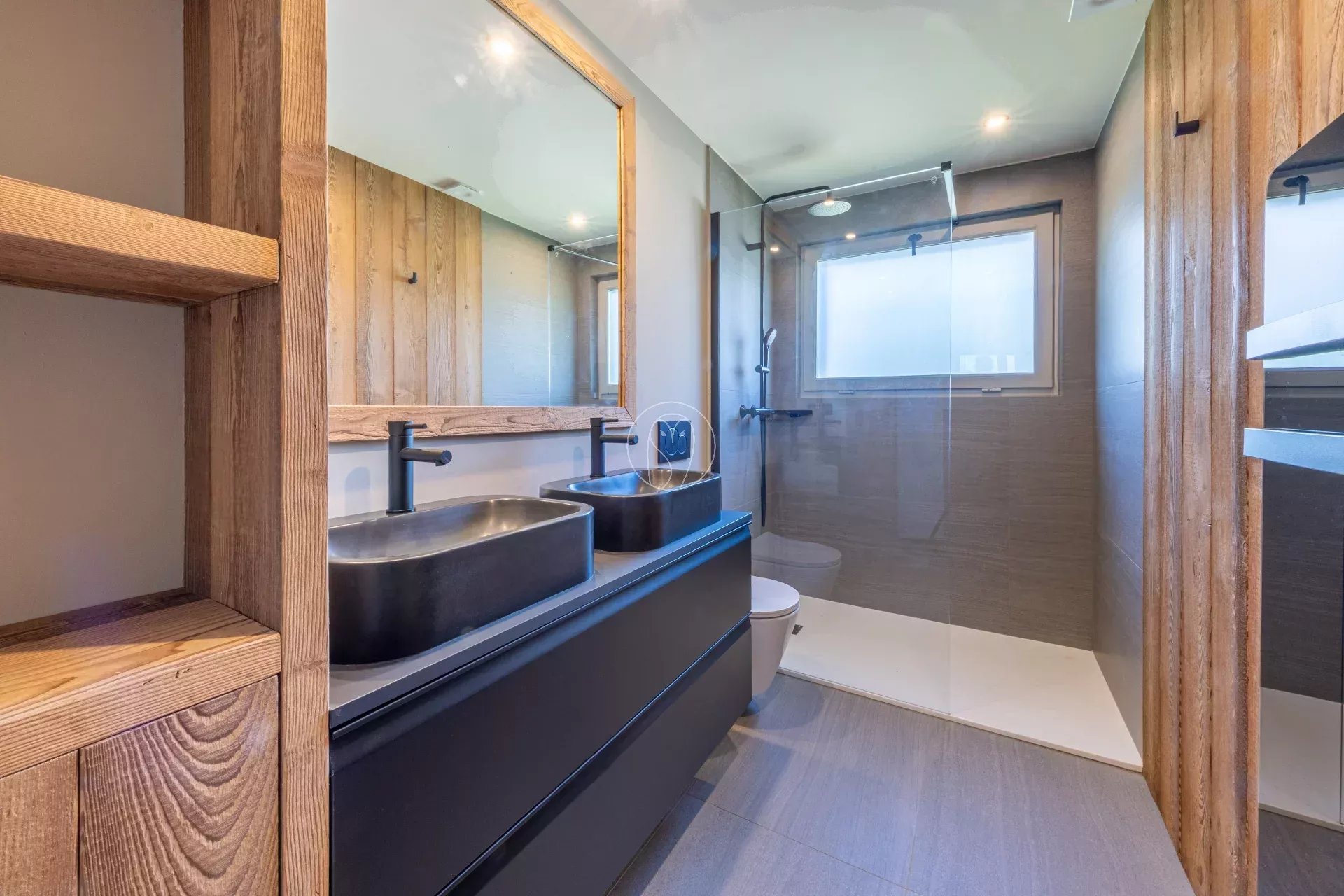 Au rez-de-chaussée, vous trouverez un hall d’entrée, deux chambres spacieuses en suite avec rangements, toutes deux bénéficiant d’un accès direct à la terrasse et au jardin. Ce niveau comprend également un ski-room et une buanderie.