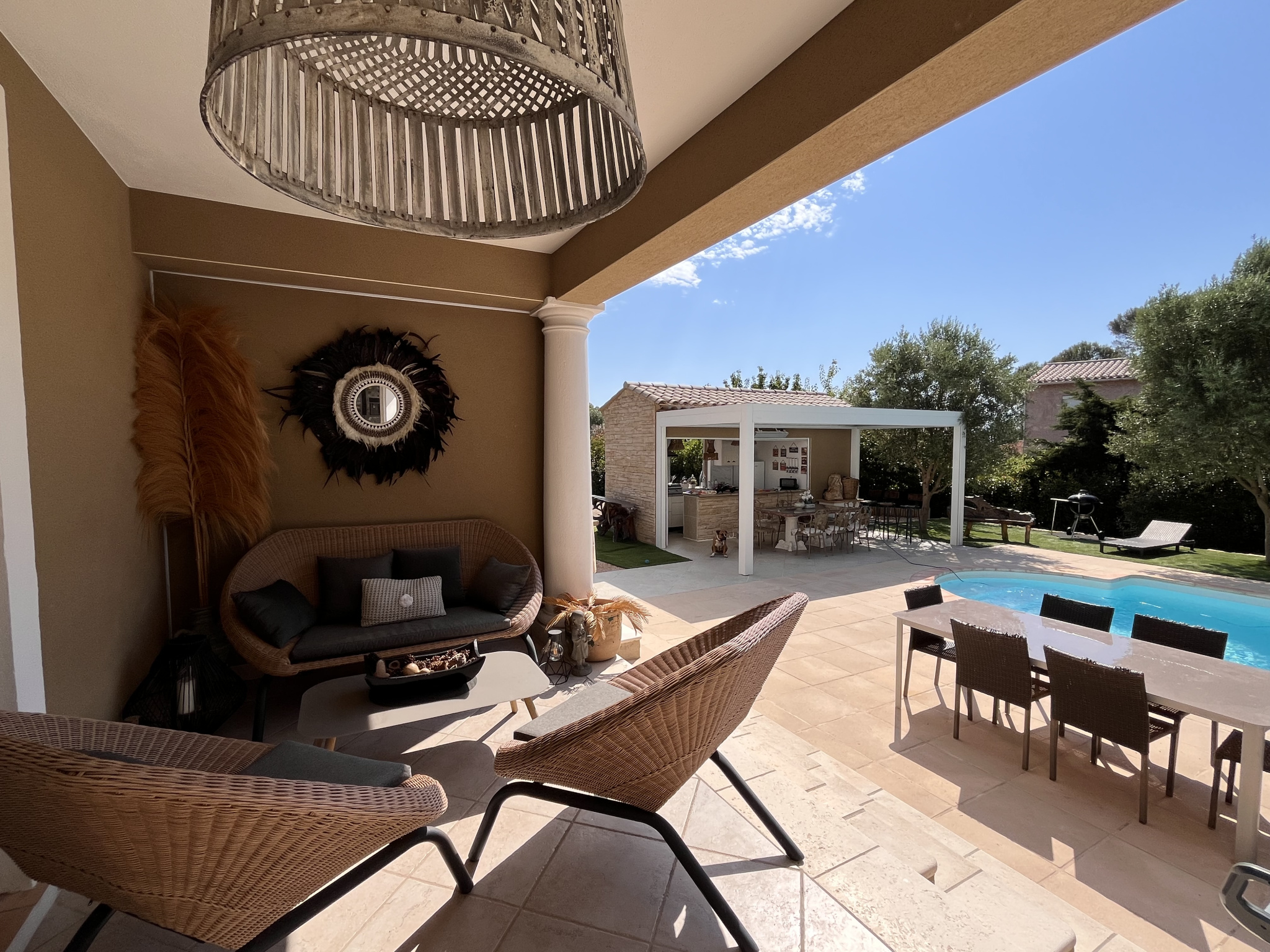 Dans un environnement résidentiel calme, Villa au style Néo-Provençale comprenant une entrée, toilettes invités, cuisine ouverte sur un séjour double, cellier salle de billard. Une suite aprentale avec spacieux dressing et salle d'eau attenante. A l'étage : 2 lumineuses chambres 2 donnant accès à une terrasse avec vue mer, une salle d'eau avec toilettes, une salle de bains complète (bain, douche, toilettes). Un superbe terrain plat et paysager de 1112m2 avec terrasse couverte, piscine au sel, pool house, pergola bio climatique. Grande Cave en sous-sol. Domotique, alarme, caméras, climatisation, arrosage automatique, façade refaite, car port pour 2 voitures.