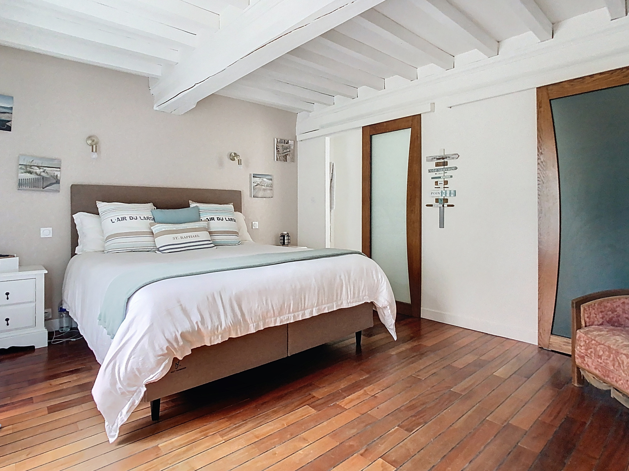 Au premier étage : un couloir desservant une chambre, un bureau et une salle de bains avec WC. Au deuxième étage : une pièce avec deux espaces de couchages.