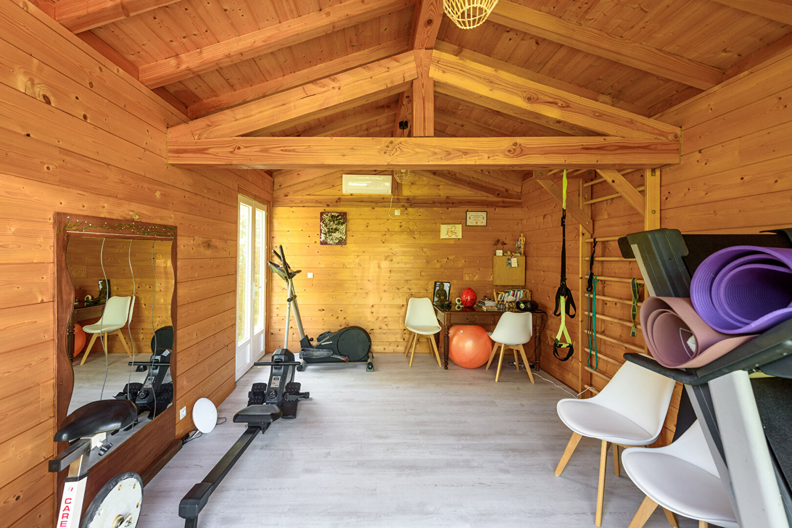 Le garage offre deux places, couvertes et un grenier aménagé en salle de jeux à la manière d'une cabane pour les enfants. Places de parking.