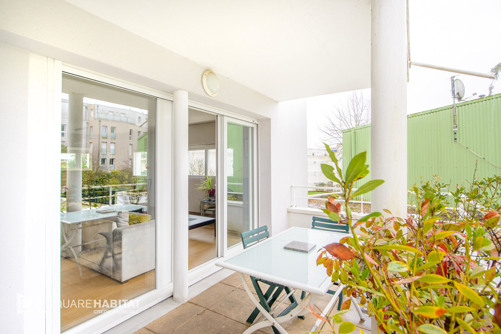 Il comprend une entrée, une pièce de vie traversante de plus de 40 m² avec sa cuisine ouverte, aménagée et équipée, ainsi qu'une terrasse couverte donnant sur l'arrière de la copropriété.