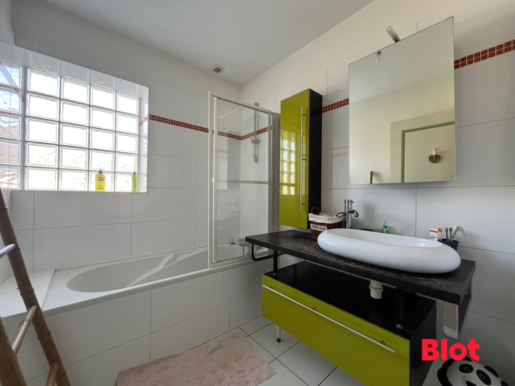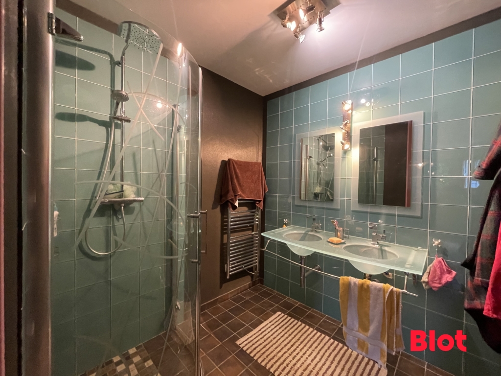 La maison offre une belle suite parentale pour plus d'intimité, ainsi que deux autres chambres confortables, une salle de bains élégante, deux WC et une buanderie bien pensée pour le quotidien.