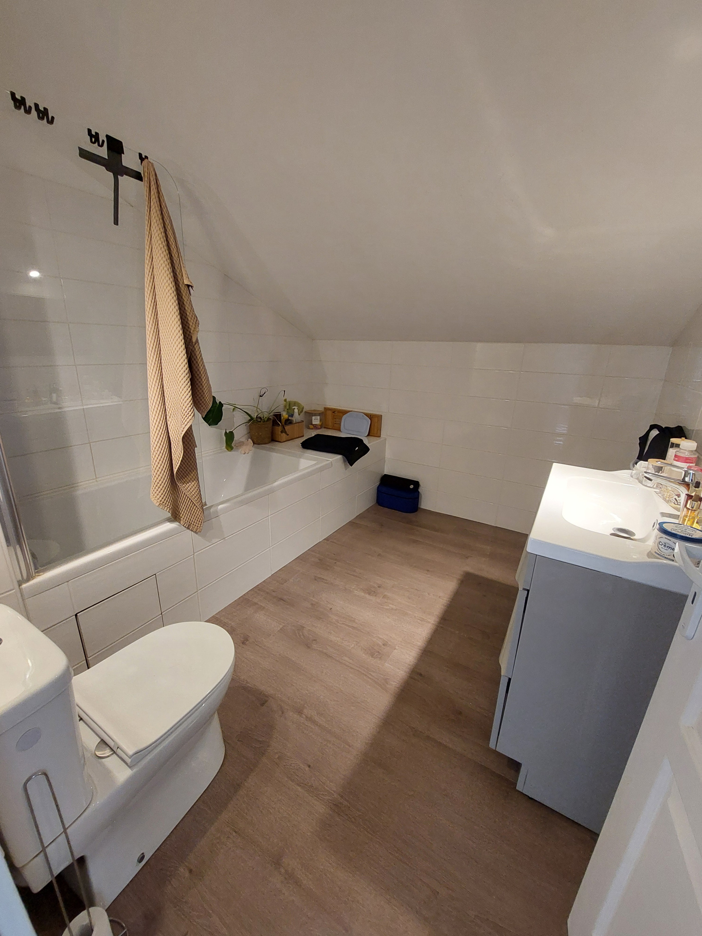 A l'étage, trois chambres dont deux de 17m2, une salle de bain. L'appartement est entièrement rénové, ensemble des huisseries en double vitrage, volets roulants électrique. Ce bien est vendu avec une cave, deux places de parking extérieures et un double garage de 23m2. Bon diagnostic énergétique. Pas de travaux prévus sur la copropriété.