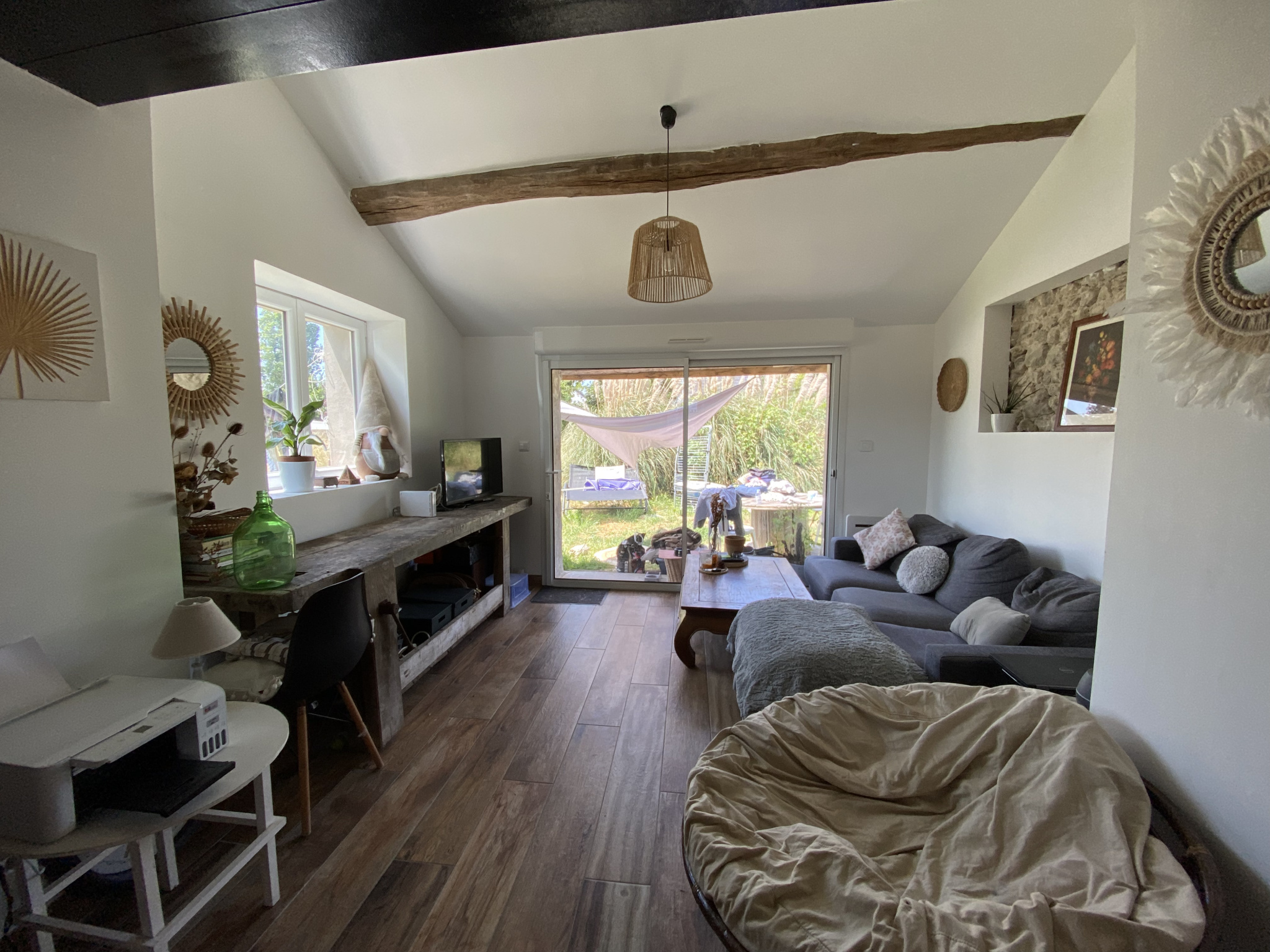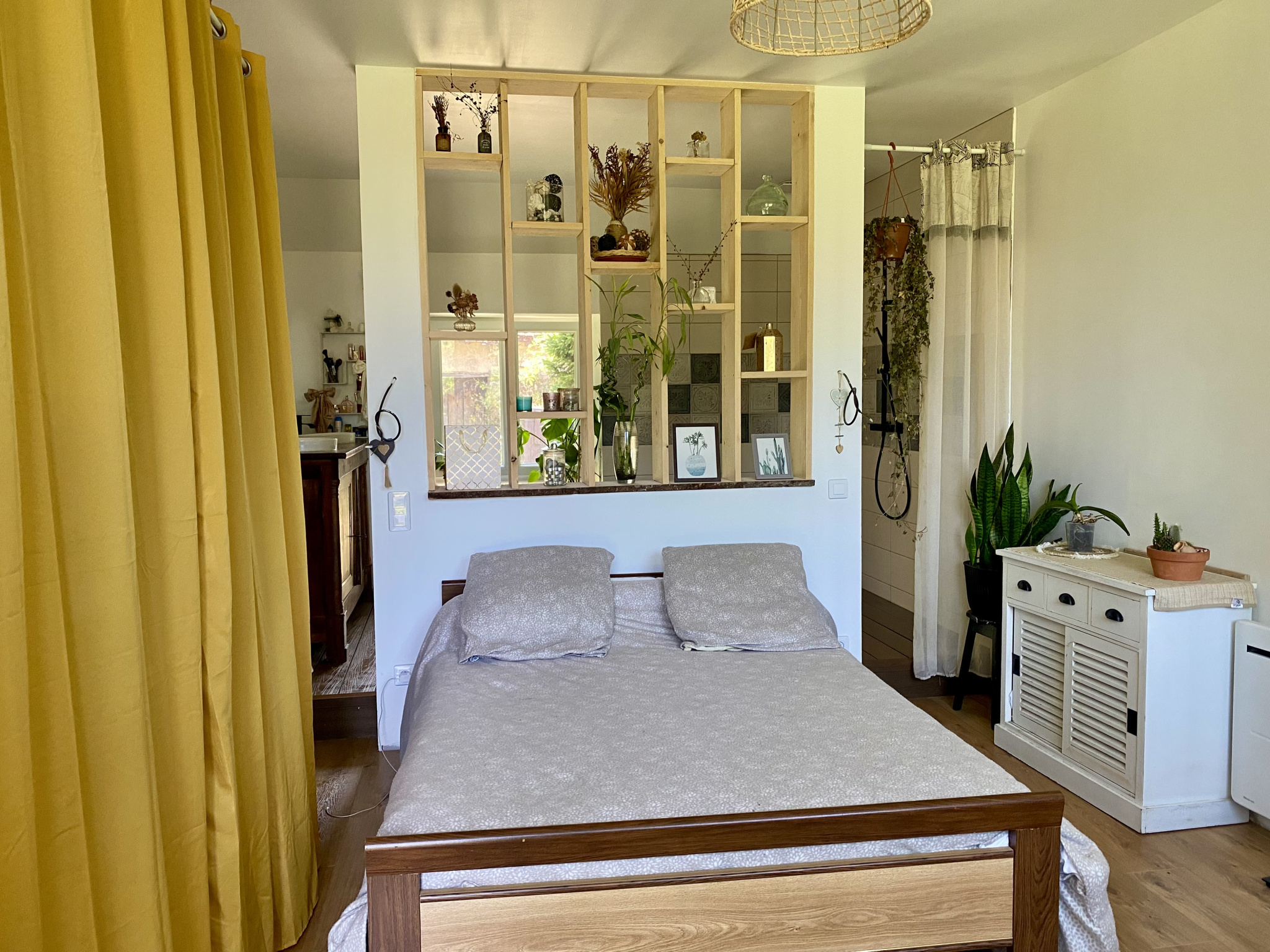 Entrée, séjour double avec poëlle, cuisine aménagée et équipée ouverte sur séjour, buanderie, wc, chambre avec salle d'eau dressing privatif.