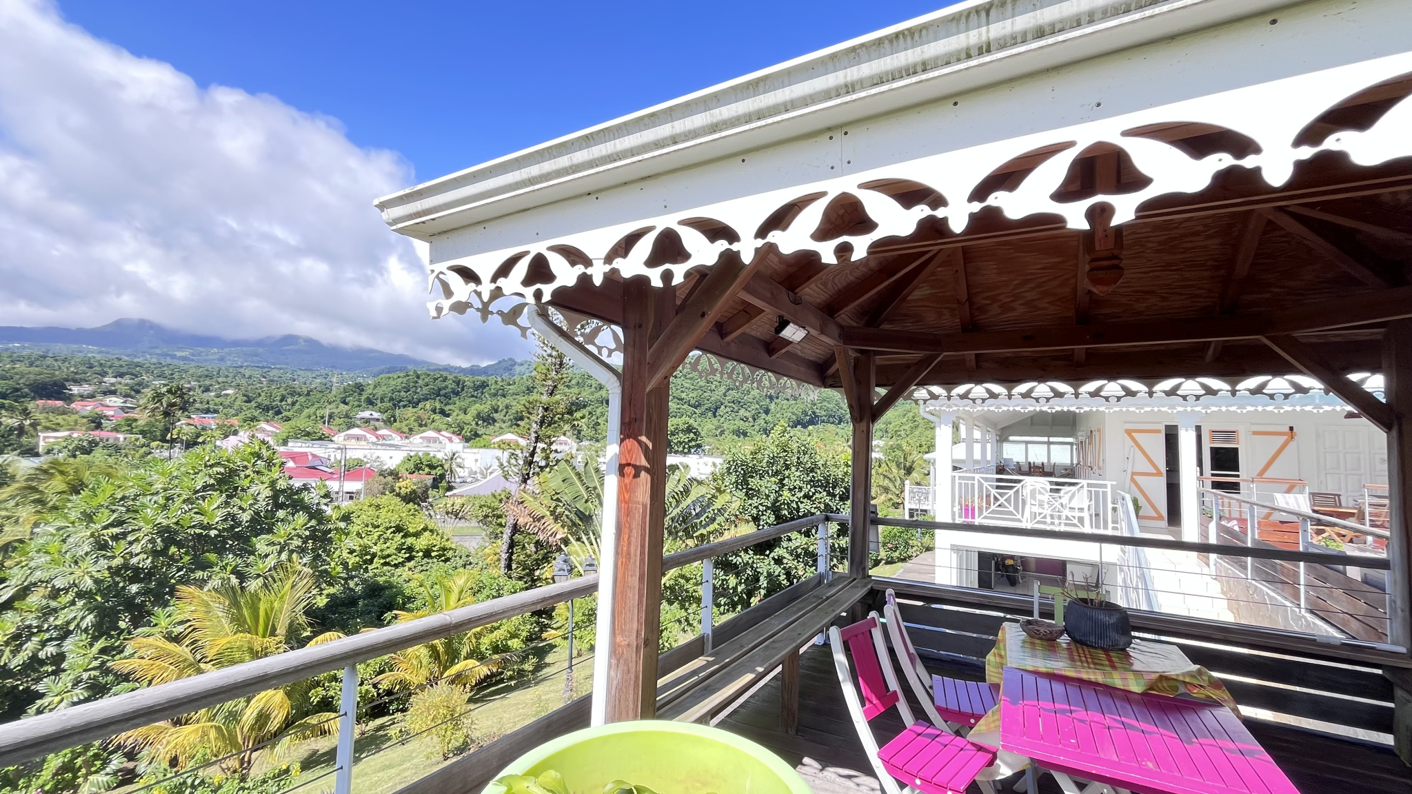 Profitez d'un cadre idyllique. Édifiée sur un magnifique jardin tropical de 2200 m2 riche de nombreux arbres fruitiers et plantes, cette villa parfaitement entretenue offre un environnement paisible et verdoyant, idéal pour les amoureux de nature et de grands espaces. Confort et détente sont au rendez-vous. Au niveau principal, une cuisine équipée ouverte sur un vaste séjour lumineux, 3 chambres, 2 salles d'eau. A l'étage, une mezzanine aménagée en quatrième chambre d'appoint ouverte avec salle d'eau, parfait également pour un bureau ou une salle de jeux. A cela s'ajoute une belle terrasse sur 3 façades pour profiter pleinement de la lumière et de l'air des montagnes.