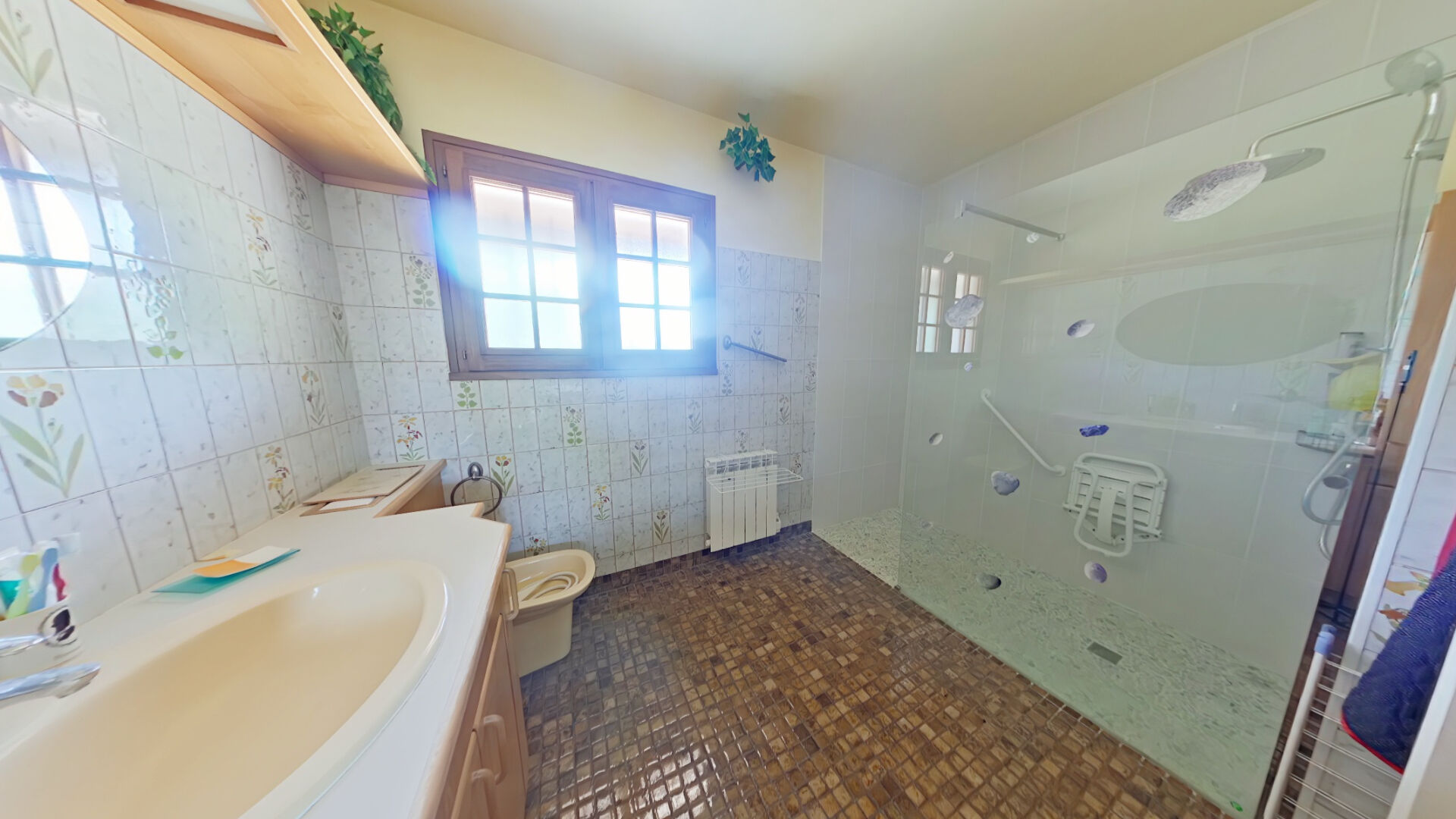 Vous disposerez également d'une grande salle d'eau de plus de 8 m², avec une douche à l'italienne confortable. Une chambre de plain-pied de 16 m² complète ce niveau, ainsi qu'une buanderie fonctionnelle et un garage.