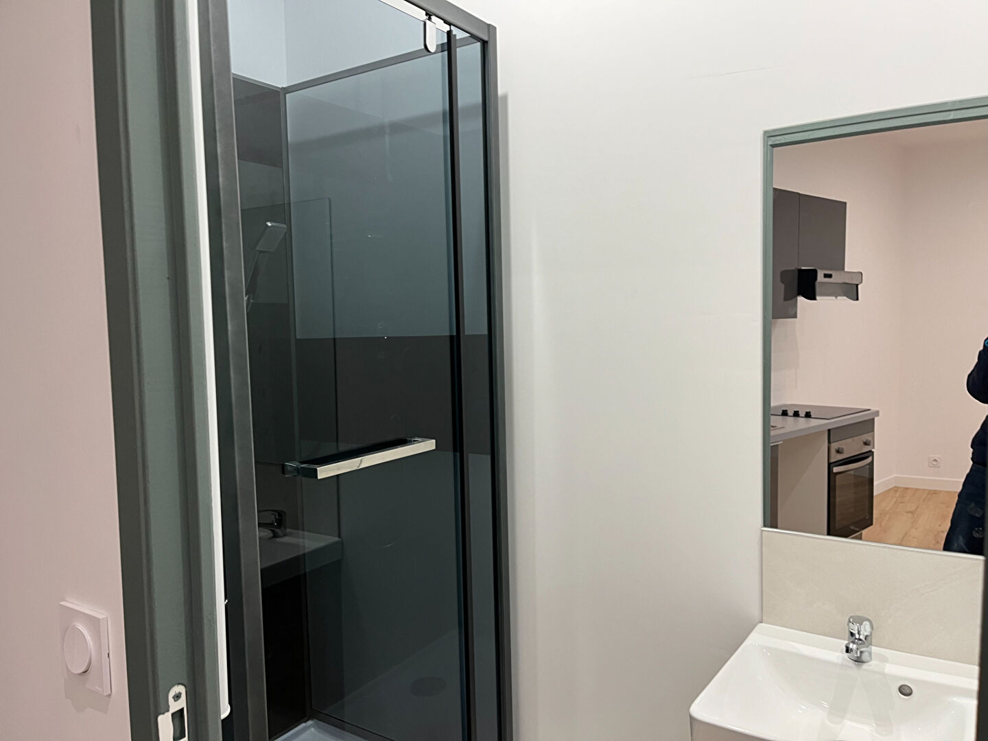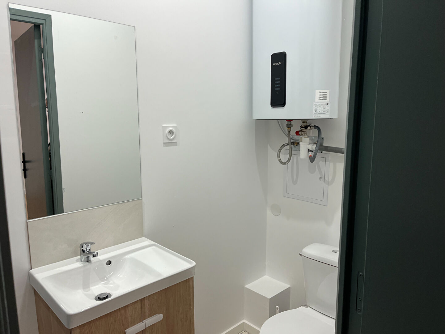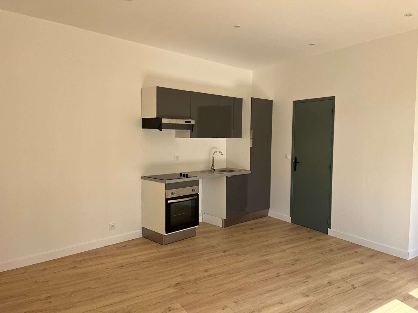 Une belle pièce de vie, avec coin cuisine aménagée/équipée (réfrigérateur, hotte, plaque de cuisson, four), une salle d'eau avec sanitaires, une belle chambre avec placard, une seconde chambre à suivre.