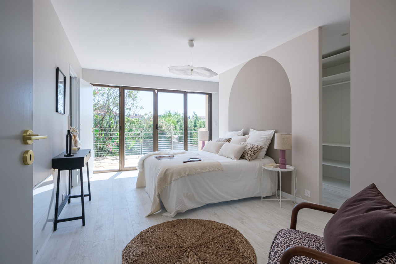 Un escalier en béton mène au 1er étage, le palier dessert 4 chambres, dont une superbe suite parentale avec dressing et salle d'eau privative donnant sur une belle terrasse. Une salle de bain et une buanderie finalisent ce niveau.