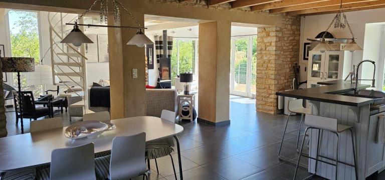 Bourgogne Côte Chalonnaise Village de charme MAIZERAY, Grand calme, jolie vue -Maison pleine de charme dans un havre de paix (magnifique rénovation) sur un ravissant terrain paysagé de 700 m² avec sa piscine chauffée et un puits - Habitation très lumineuse, grandes ouvertures composée d’une pièce à vivre accès terrasses avec cuisine équipée ouverte accès terrasse, d'une suite parentale accès terrasse avec salle de douches/wc et dressing privatifs , d’une chambre avec sa salle de douches privative accès jardin, d’une chambre, d’une salle de bains, d’un wc D’une mezzanine bureau, une partie des combles aménageables - Des dépendances - Magnifique cave voûtée, un grand garage - Gros œuvre en excellent état Huisseries double vitrage nouvelle génération, Électricité refaite, Raccordement eaux usées au tout à l’égout, Chauffage électrique et poêle à bois grande performance (pierre réfractaire) - Réf 1619 : prix 405 000 € dont honoraires inclus de 3.84 % TTC charge acquéreur Prix hors honoraires : 390 000 € - Les informations sur les risques auxquels ce bien est exposé sont disponibles sur le site Géorisques
