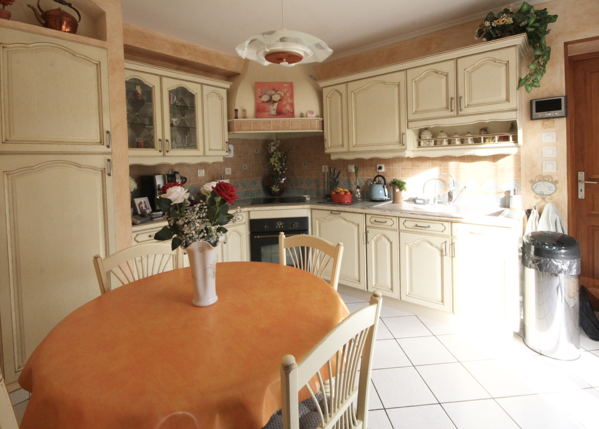Entrée, cuisine agencée et équipée, arrière cuisine, séjour / salle à manger avec insert à granules, bureau, WC.