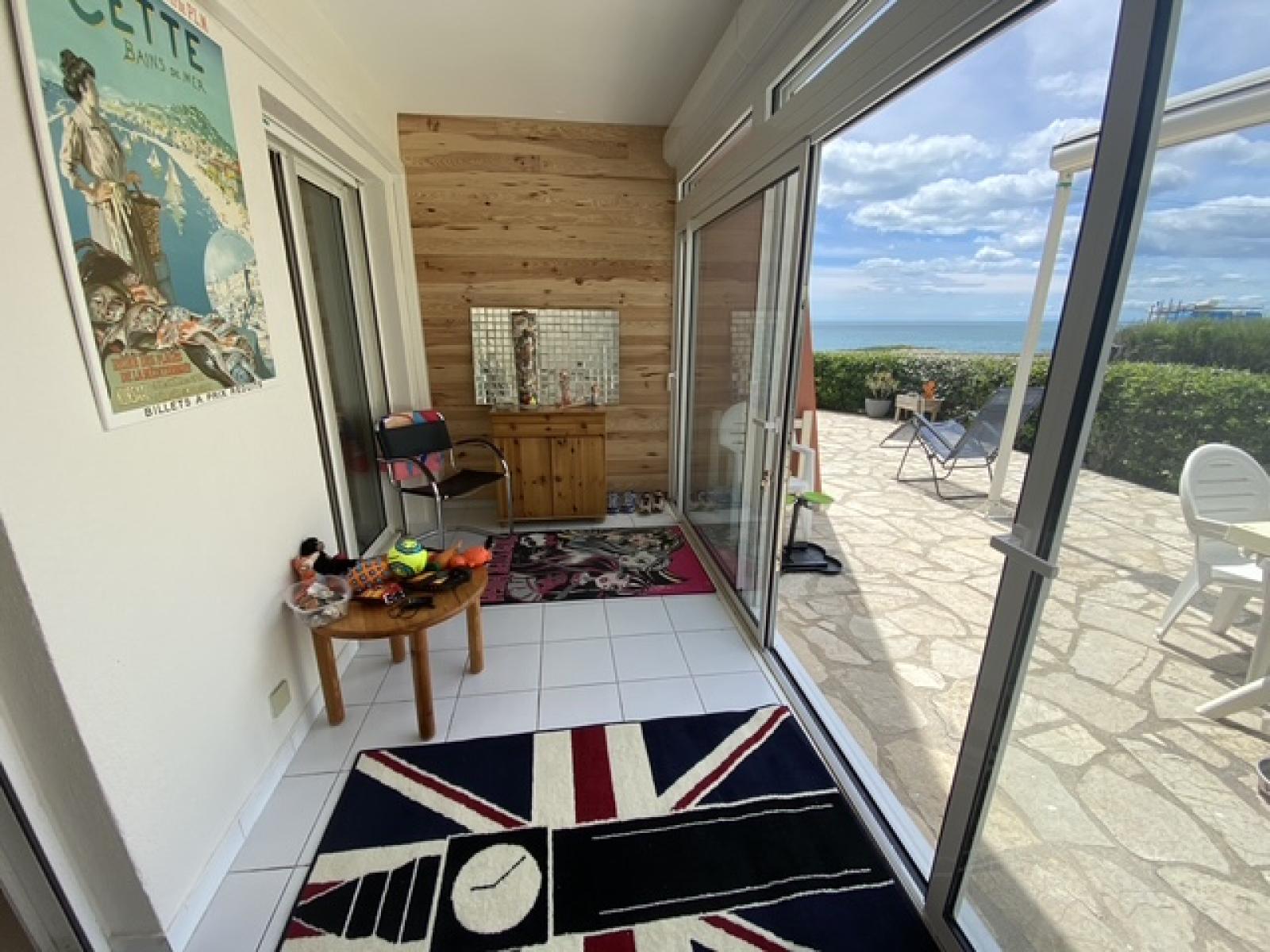 SÈTE quartier corniche en direct de la plage faux T3 avec jardin privatif d'environ 90 mètres carré en viager occupé ( unique propriétaire femme 77 ans ) avec garage et cave privative mitoyenne a cet appartement en rez de jardin de plus de 50 mètres carrés avec 2 chambres, belle véranda sur le jardin et une pièce principale donnant plein sud et sa terrasse ombragée