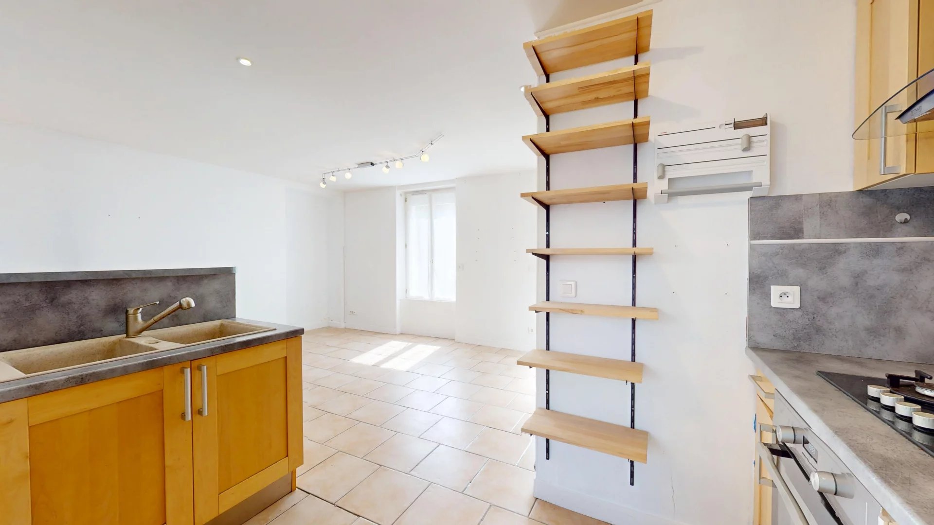 Au rez-de-chaussée, une pièce de vie lumineuse de 24 m² avec salon et cuisine ouverte, un WC indépendant et un coin buanderie.