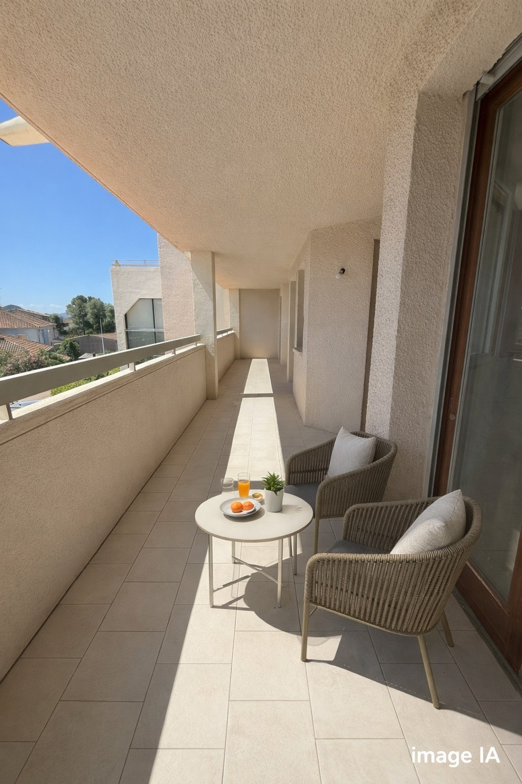 Grande terrasse couverte de 21 m2, véritable extension de la pièce à vivre pour profiter du climat méditerranéen.