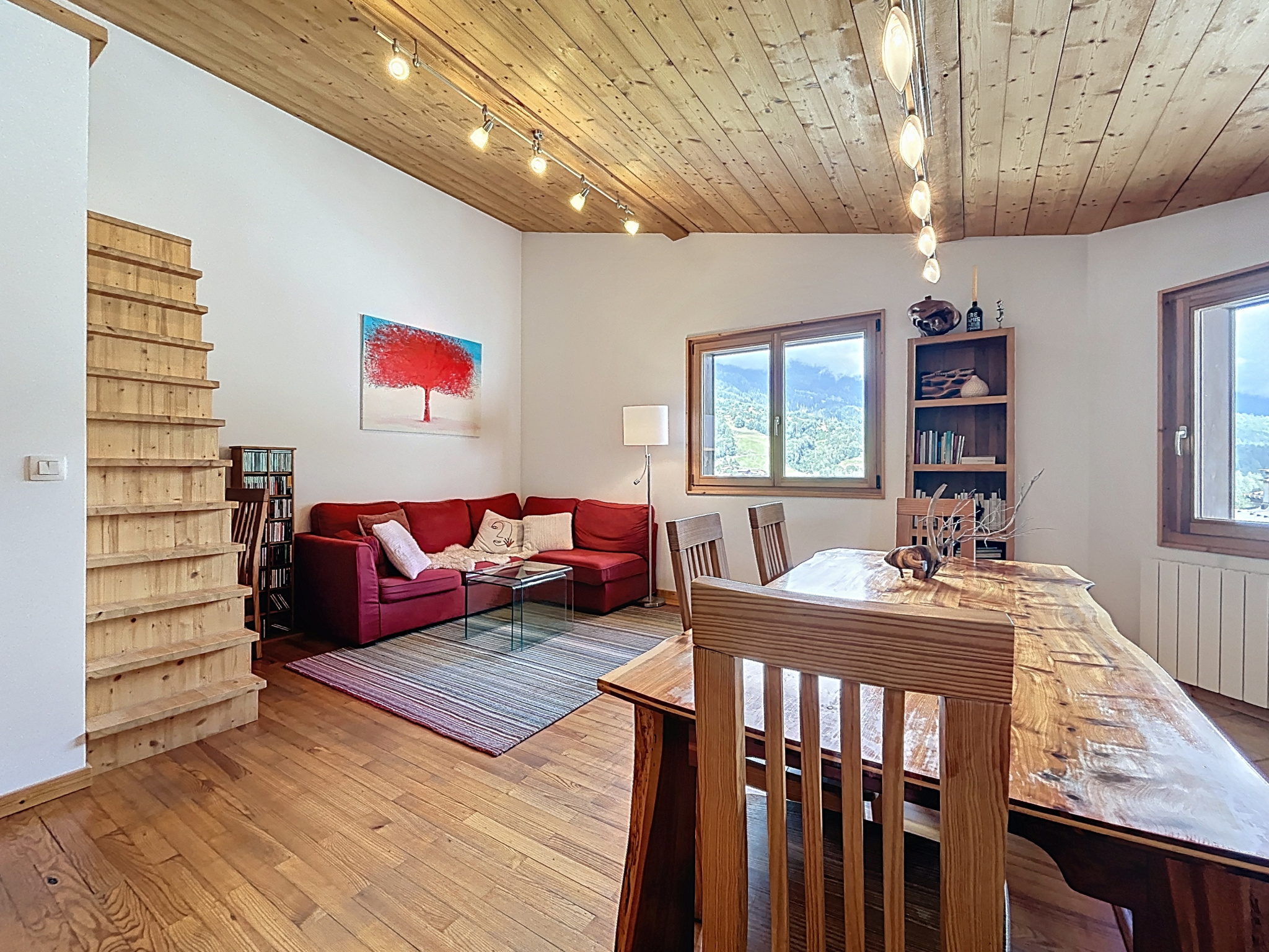 Vallée de Chamonix-Mont-Blanc, Les Houches, bel appartement de 2 pièces situé au dernier étage d'une petite copropriété avec peu de charges, en plein coeur du village. Traversant, baigné de lumière, il offre un spacieux séjour exposé ouest, avec cuisine ouverte, agrementé d'un espace cosy aménagé sous les combles -- parfait pour un couchage d'appoint ou du rangement discret.