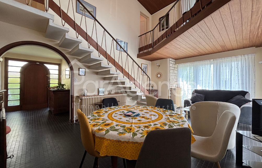 Rez-de-chaussée : Entrée accueillante, séjour lumineux avec belle hauteur sous plafond, cuisine séparée, deux chambres avec placards, WC. Étage : Deux chambres supplémentaires, salle de bains avec WC et mezzanine offrant un espace modulable selon vos besoins. Sous-sol : Garage et buanderie pratiques pour le rangement et les activités du quotidien.