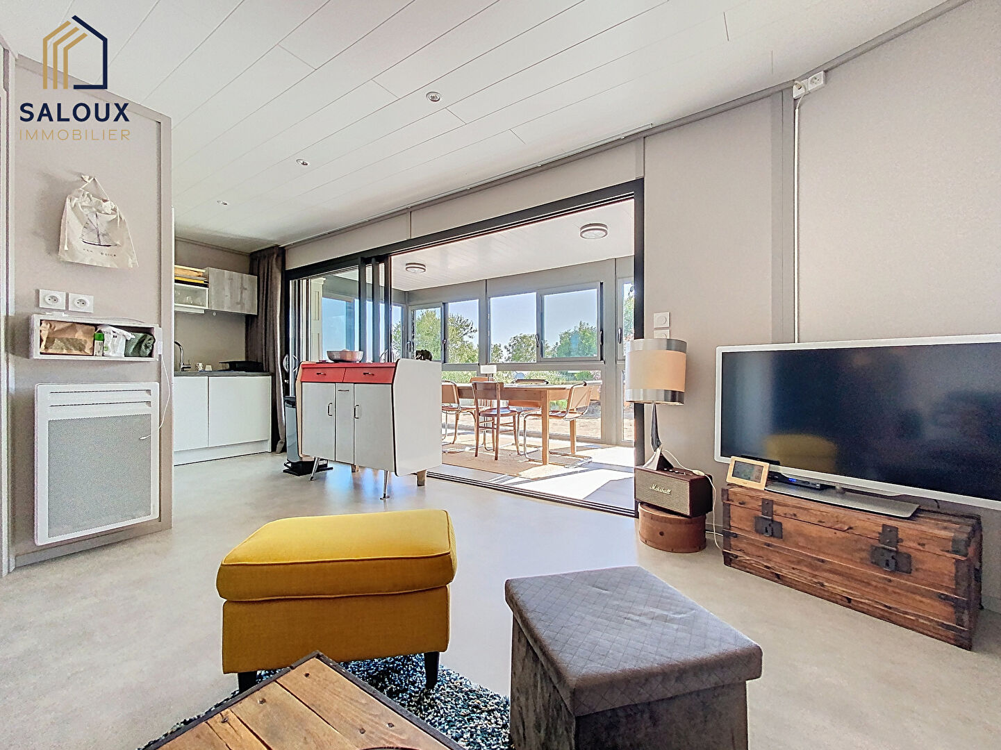 Implanté dans un cadre paisible et verdoyant à Arzal, à deux pas du port, ce chalet de 2020, parfaitement entretenu, vous séduira par son confort et sa luminosité :