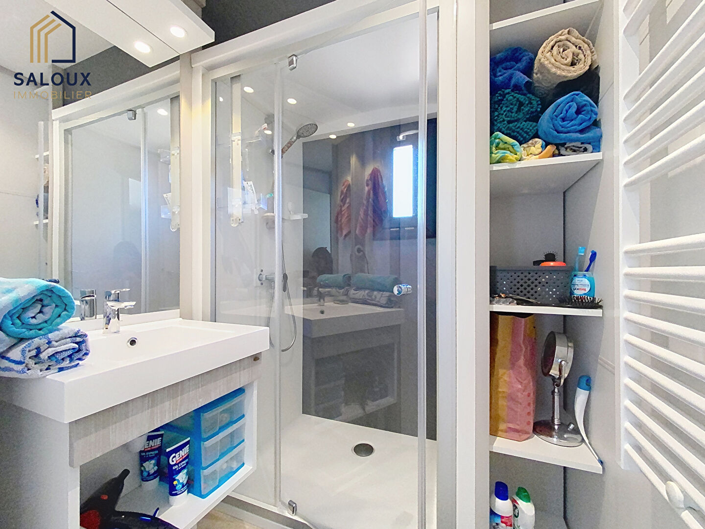 Une salle d'eau avec accès à une buanderie pratique