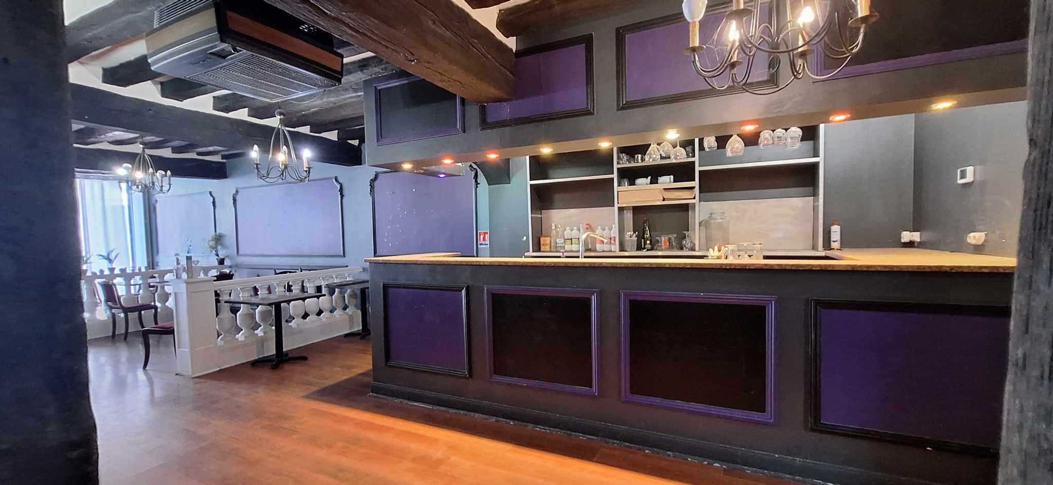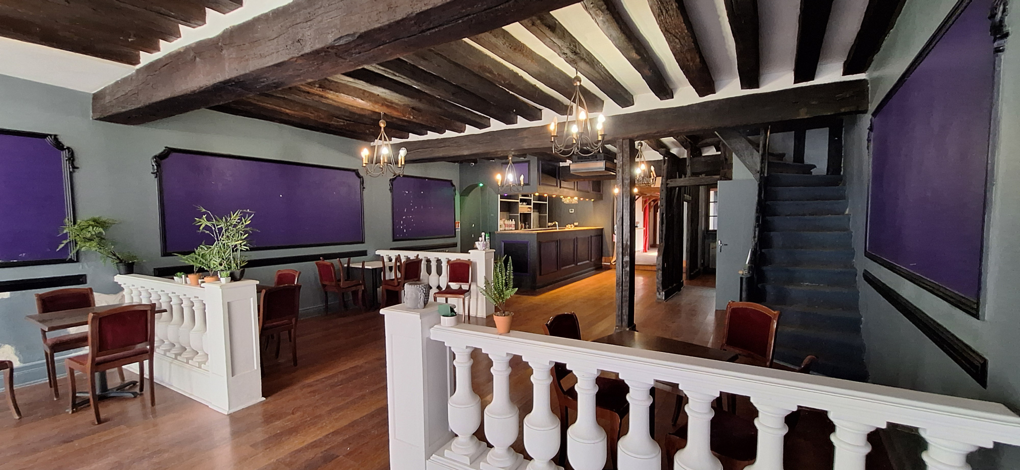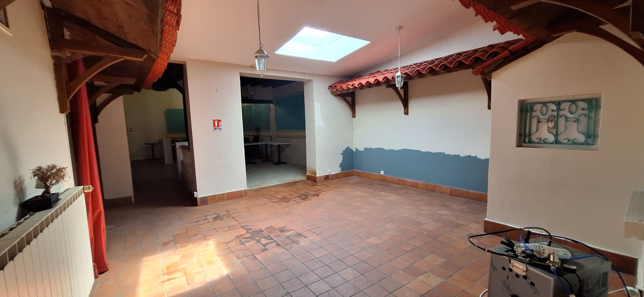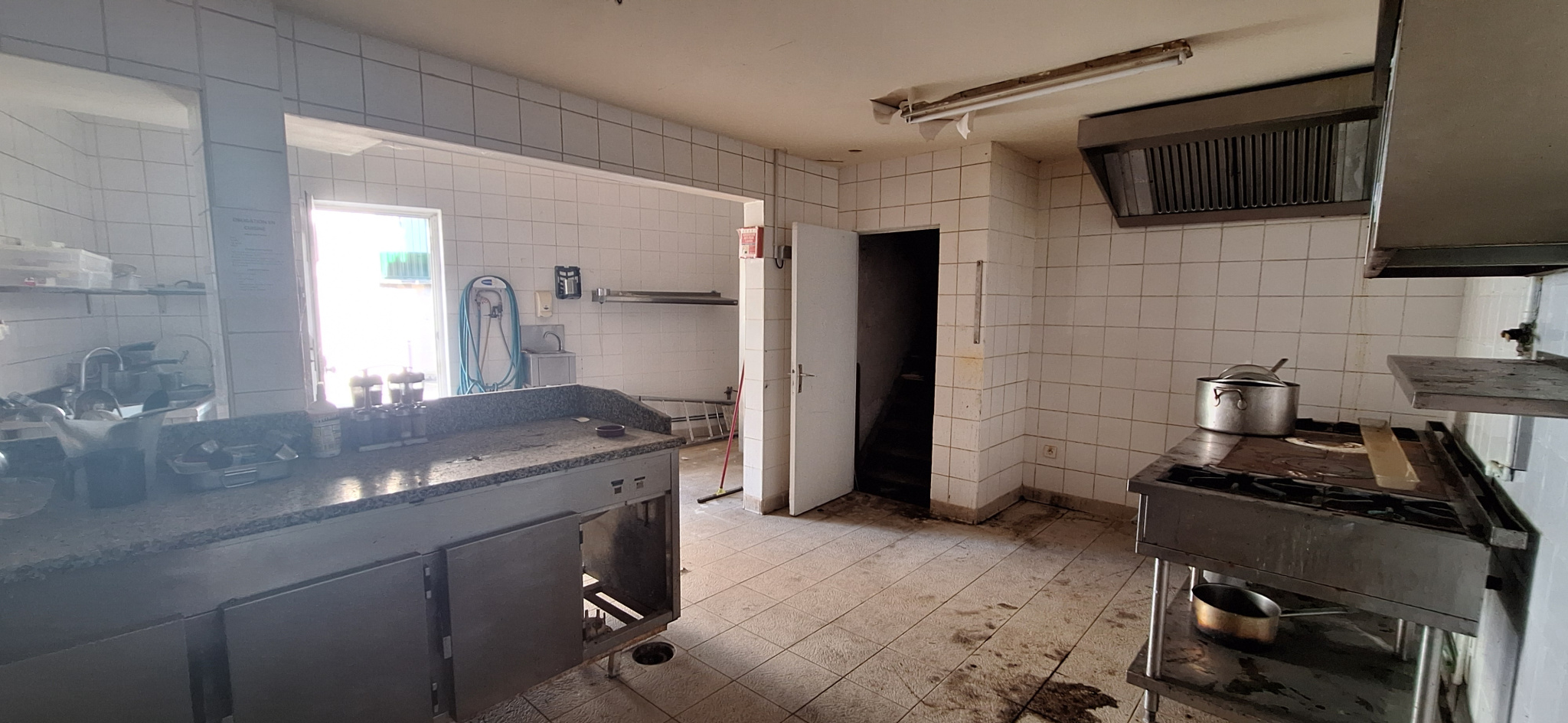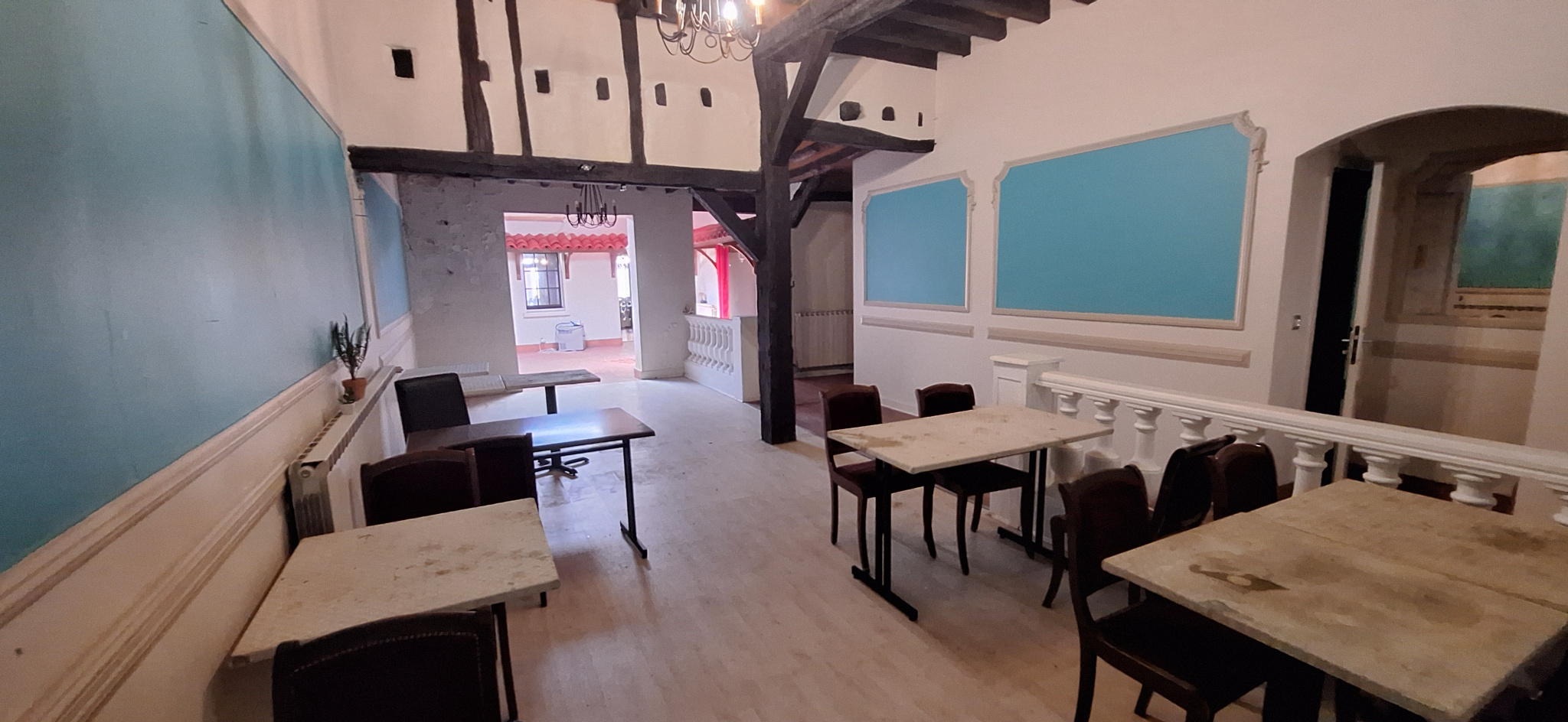 Actuellement composé d'une salle principale de réception avec zone d'accueil : env. 90 à 130 m2, d'une cuisine professionnelle (avec grenier au-dessus), de deux wc (dont un aux normes PMR),et un accés privatif crée pour les personnes à mobilités réduites et une cave saine d'environ 38 m2.