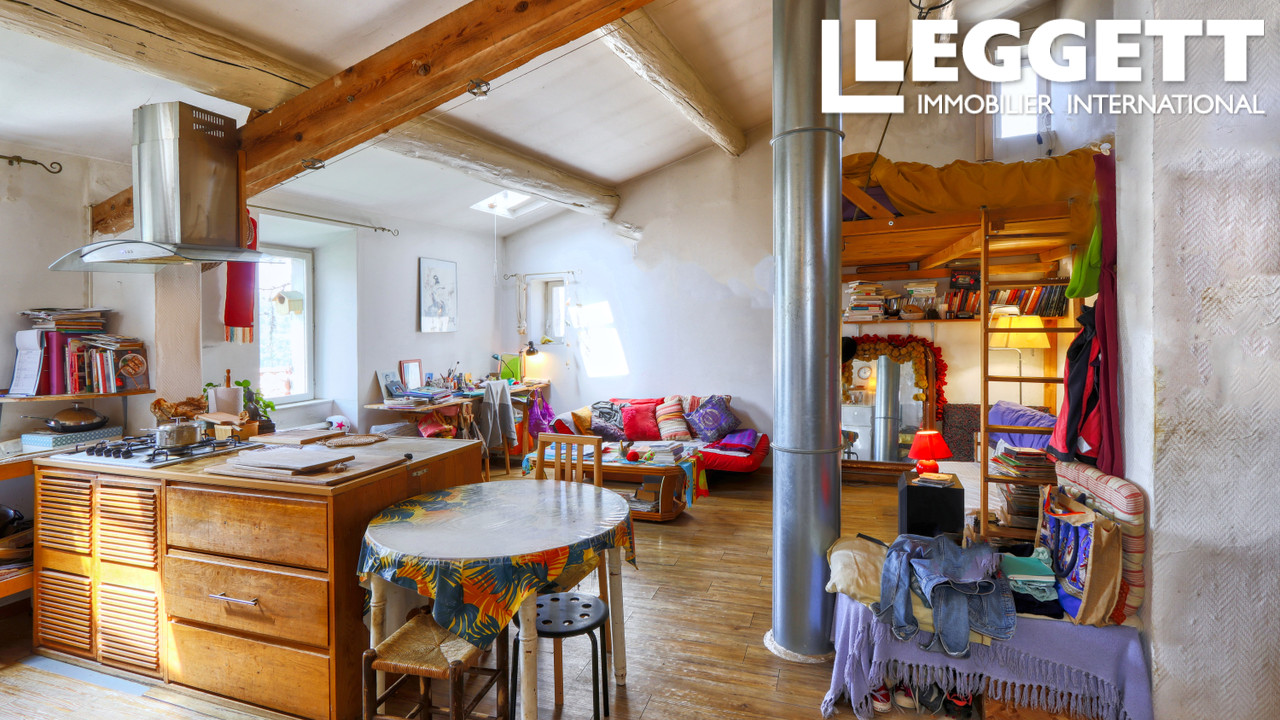 Organisée sur trois niveaux, elle offre à l'étage supérieur un bel espace lumineux de 33 m², accessible par un escalier extérieur en pierre menant à une petite placette calme. Ce niveau, très agréable, comprend une cuisine ouverte, un salon, un coin nuit en mezzanine, et bénéficie d'une belle vue plein sud sur les collines environnantes.