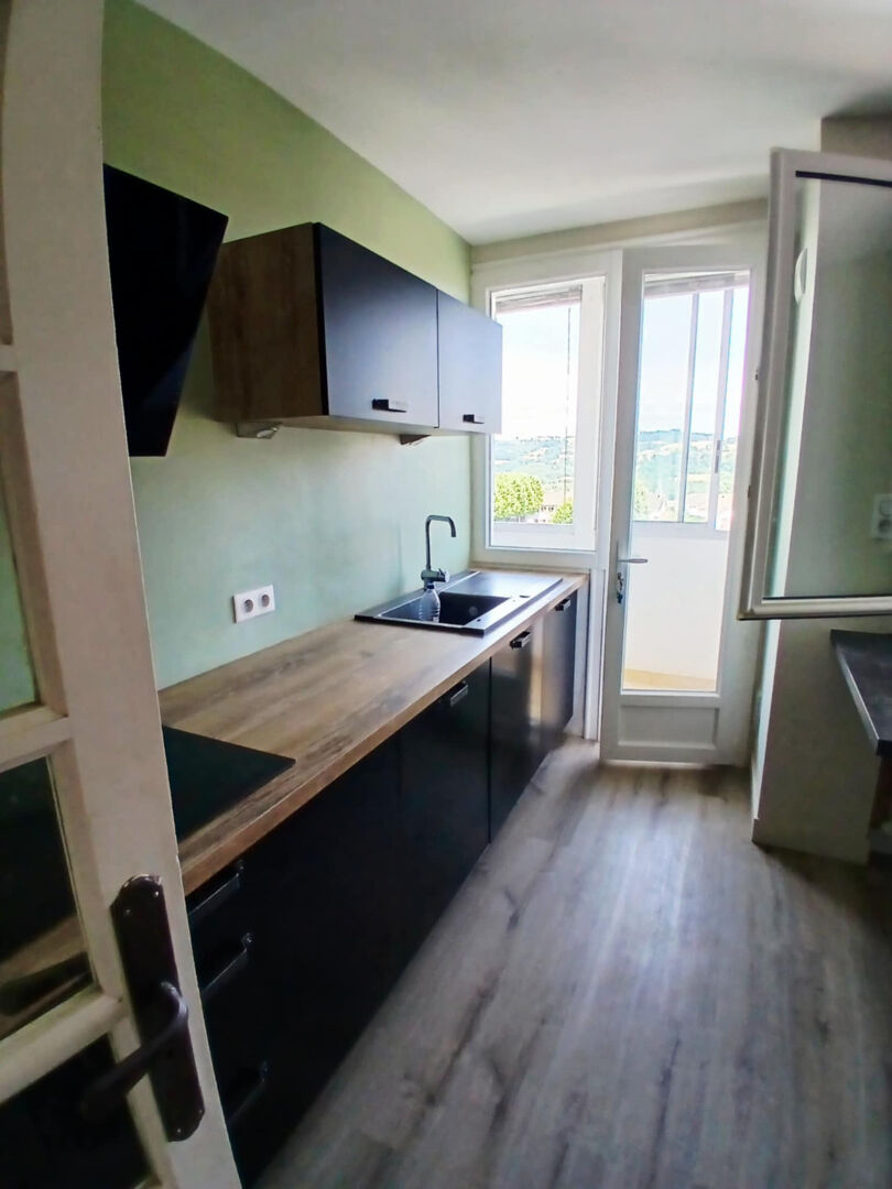 Une cuisine indépendante entièrement meublé et équipée en électroménager (frigo, lave vaisselle, four, micro onde, plaque, hotte, machine à laver) avec son accès sur sa loggia avec une belle vue dégagée