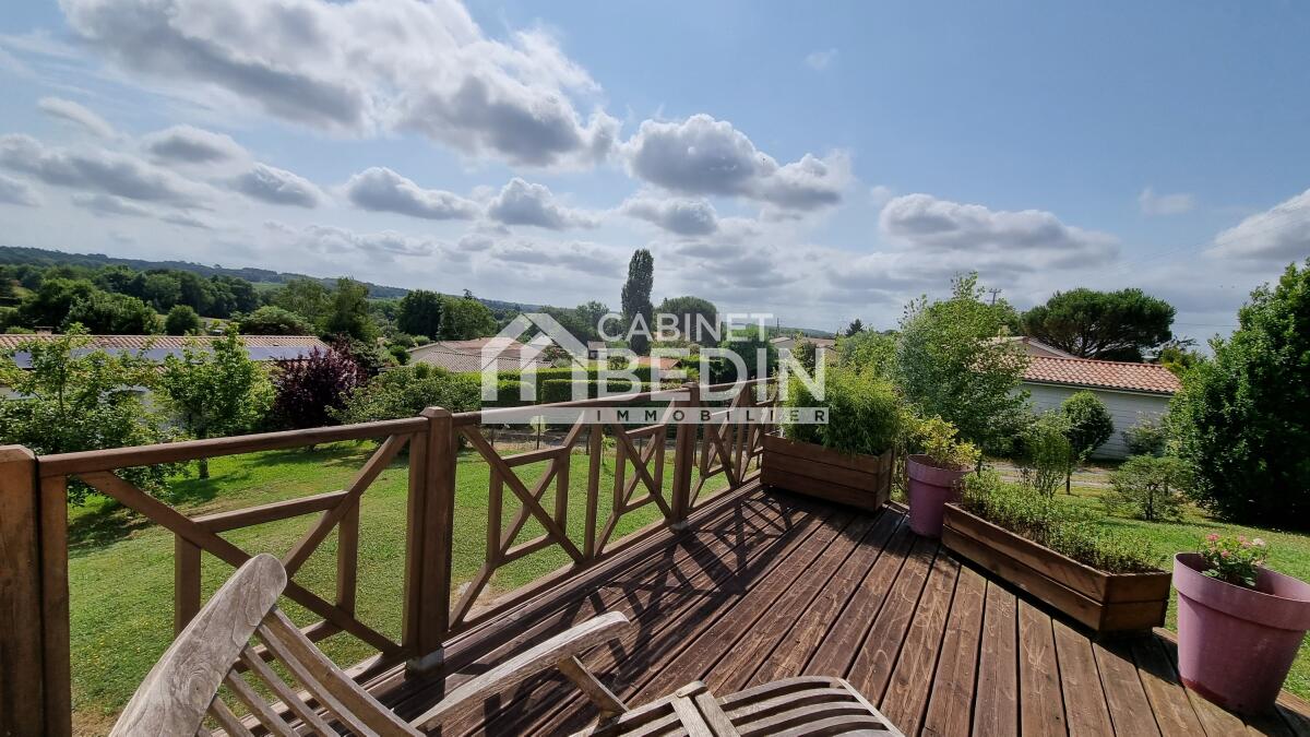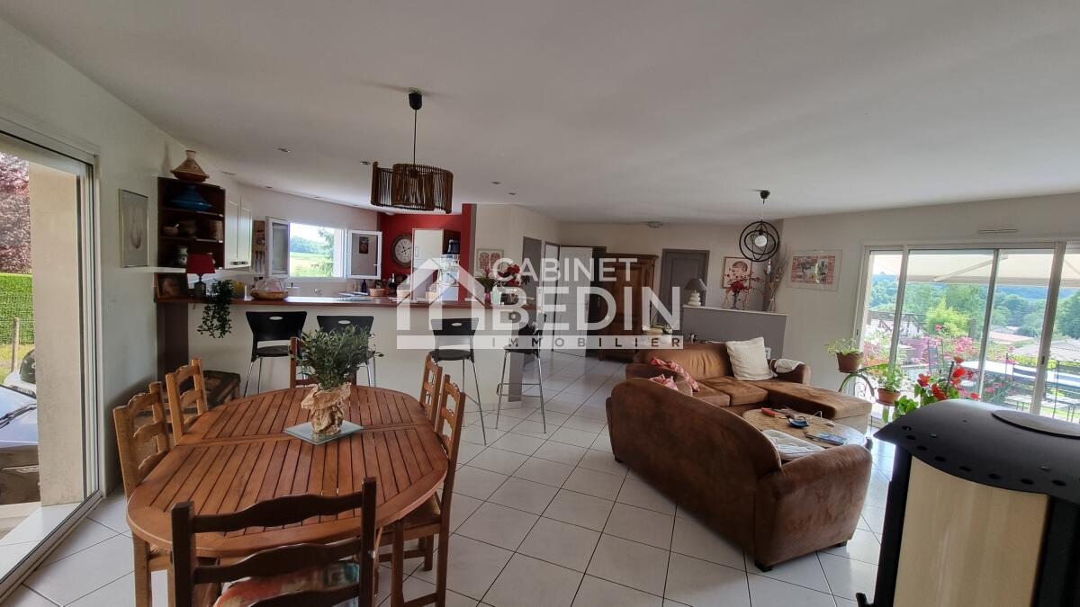 TARGON. Agréable maison familiale élevée sur un sous-sol total, en partie aménagé en habitable. Elle vous offre une vaste pièce de vie composée d'un séjour et d'une cuisine ouverte donnant à l'arrière sur une terrasse en bois surplombant le jardin. Côté nuit, vous profiterez de 5 chambres dont une suite parentale disposant d'un dressing, un vaste bureau, une salle d'eau et une salle de bain ainsi qu'une buanderie. Vous apprécierez également une partie garage. Un joli jardin arboré tout autour de la maison complète le tout.