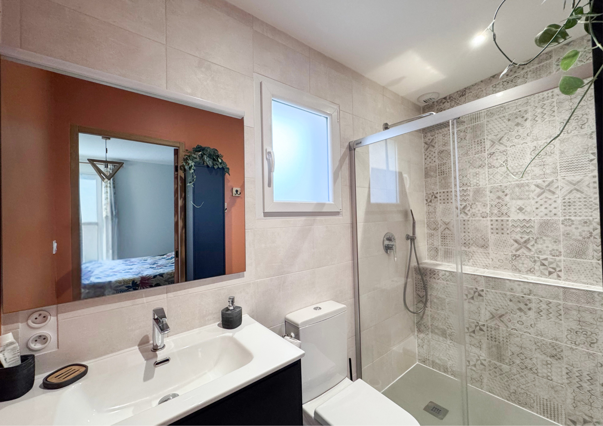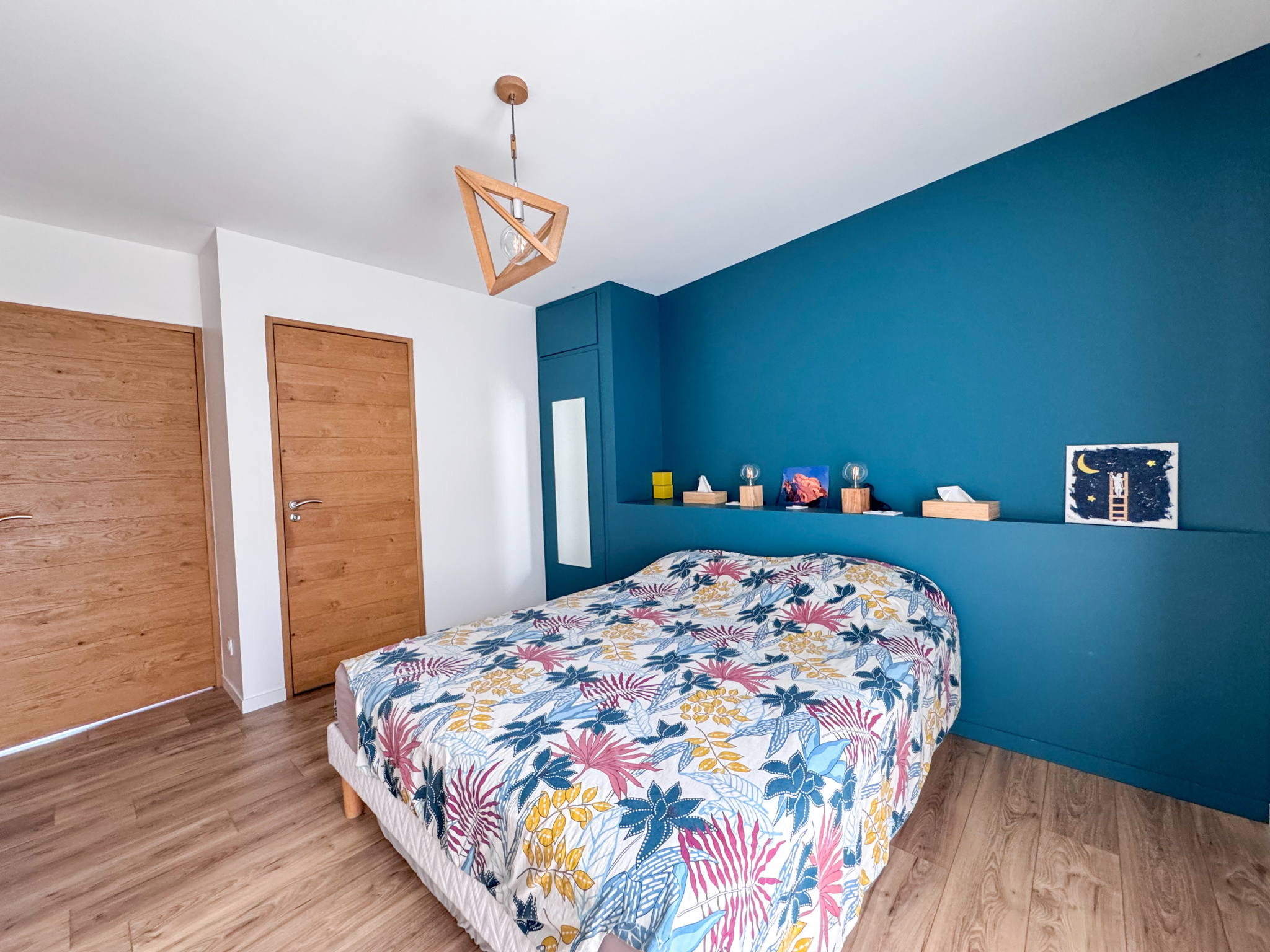 1 suite parentale de 12,87 m2 avec dressing aménagé de 3,85 m2 et salle d'eau privative (vasque, douche, WC, fenêtre, VMC)