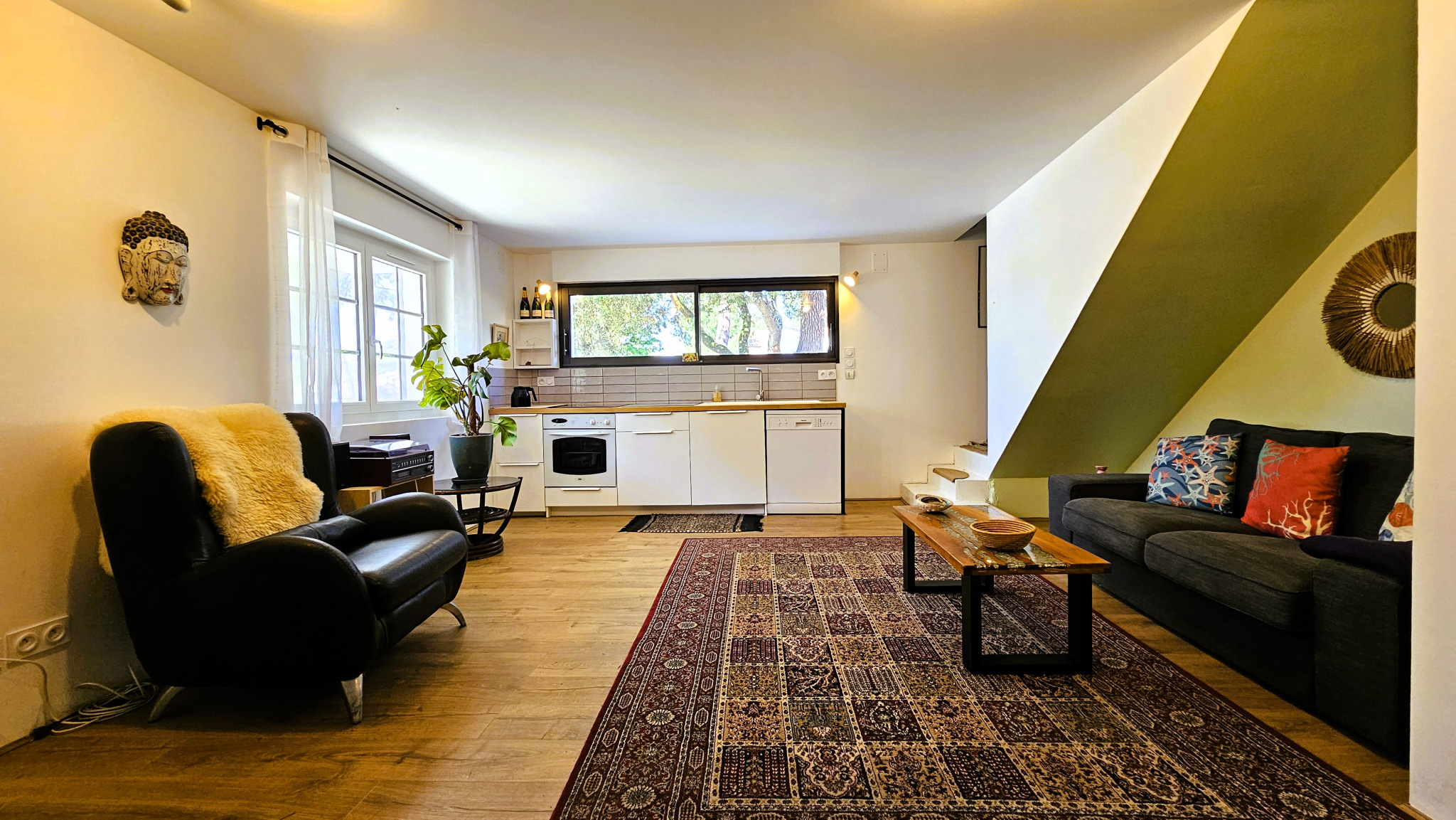 L'étage principal, en rez-de-chaussée surélevé, comprend une pièce de vie traversante triple exposition de plus de 50m2avec cuisine équipée ouverte et accès sur terrasse filante et jardin. Ce niveau est complété par une chambre confortable avec placard, un dégagement, une salle d'eau récente avec douche à l'italienne récente et des WC indépendants.