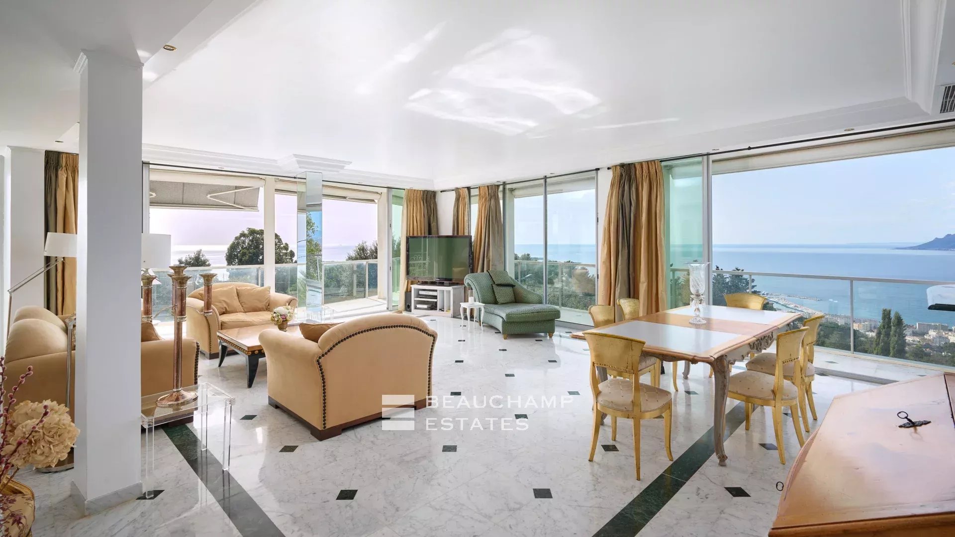 Située dans un domaine privé et sécurisé, cette villa offre une vue mer panoramique imprenable sur la baie de Cannes, les îles de Lérins et l'Esterel.