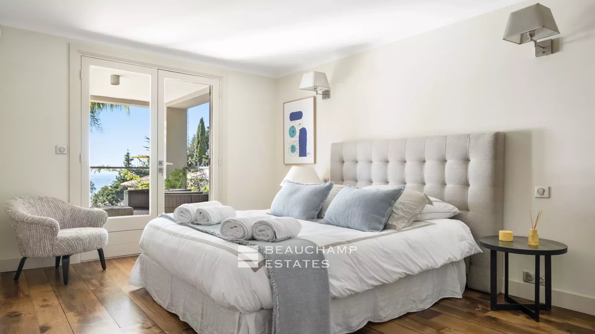 La propriété bénéficie d’une piscine et d’une cuisine d’été, toutes deux offrant une vue spectaculaire sur la Méditerranée.