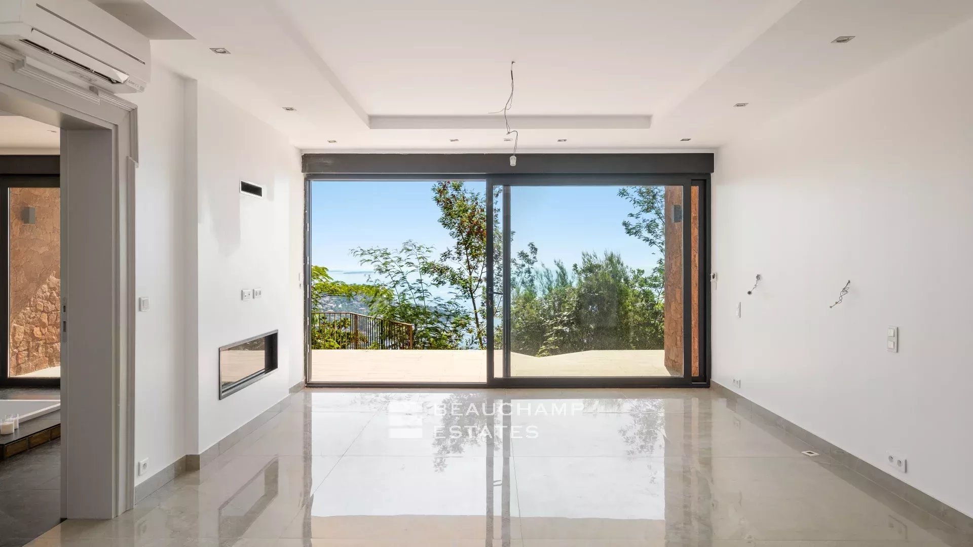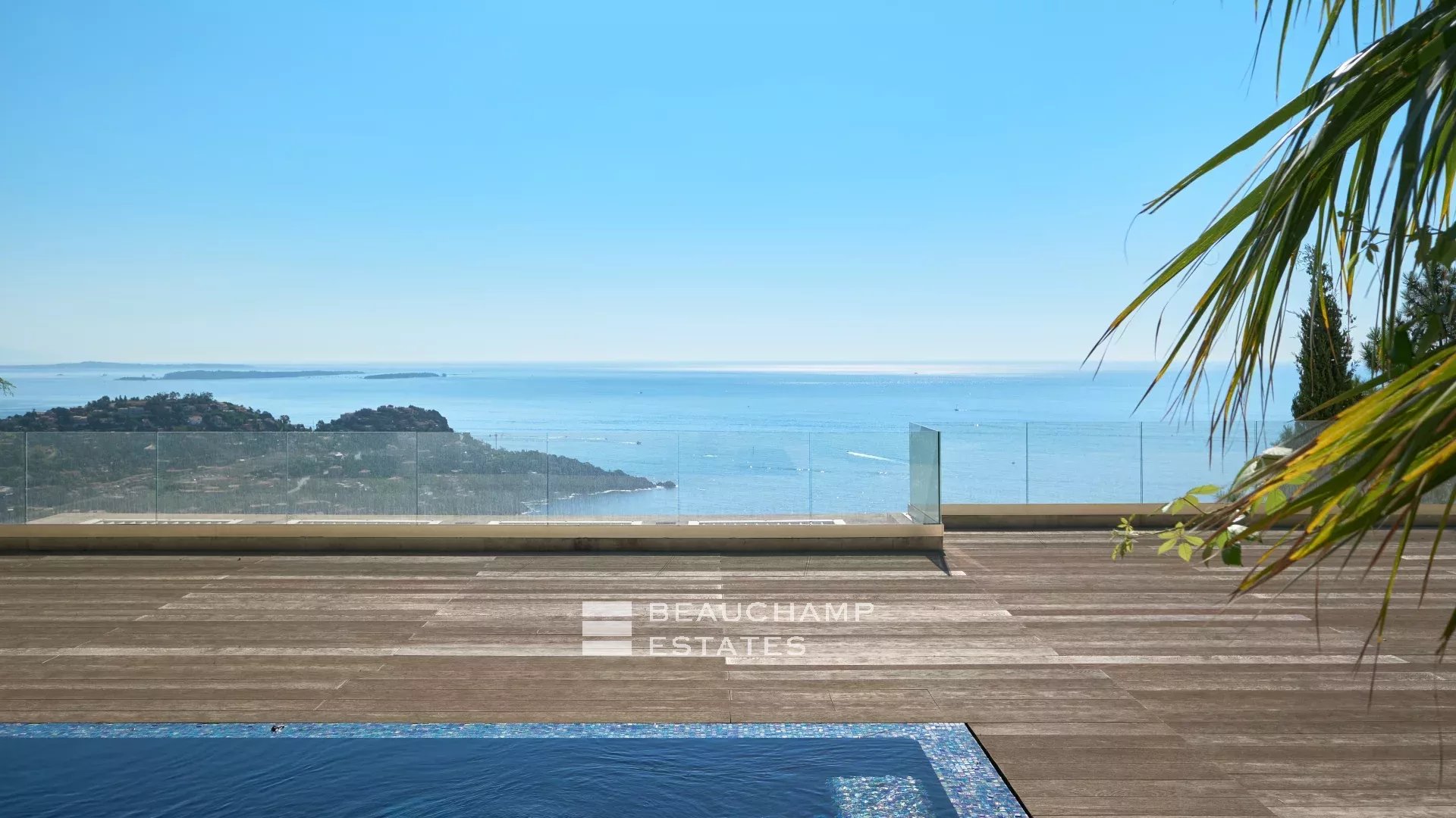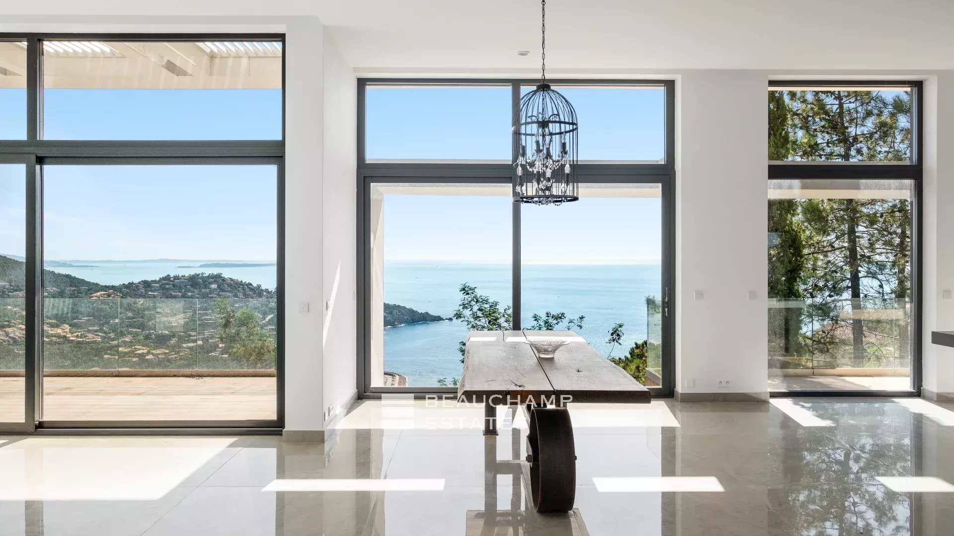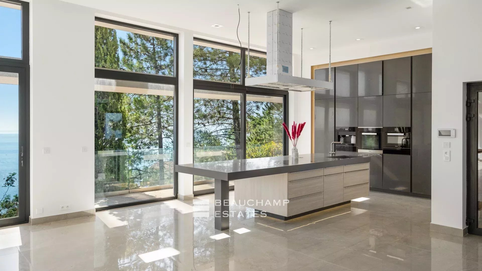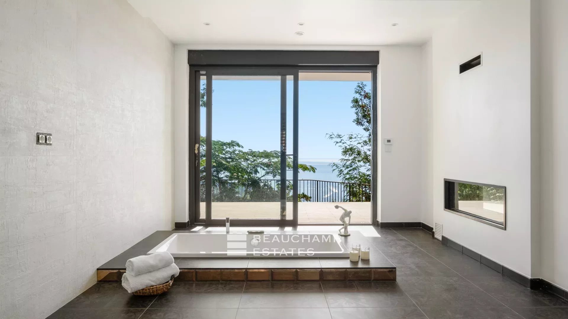 Au premier étage se trouvent un vaste séjour baigné de lumière, une cuisine design, une cave à vin, un bureau et une cuisine d’été. Le niveau jardin abrite quatre chambres, dont une suite parentale avec une salle de bain d’une ampleur exceptionnelle. Chaque pièce bénéficie d’une vue imprenable grâce à de larges baies vitrées et d’un accès à sa propre terrasse.