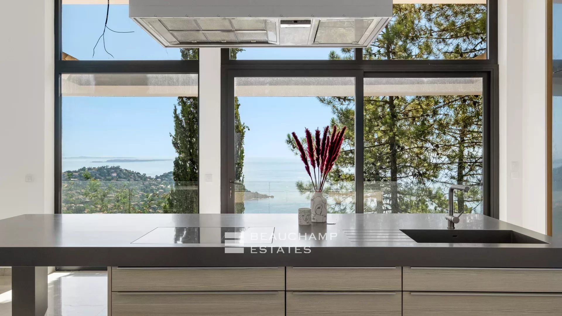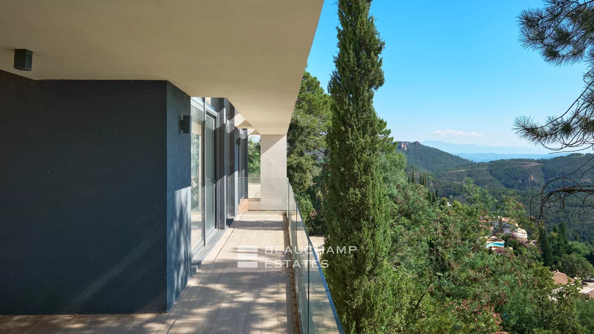 Nichée dans un cadre paisible au pied du massif de l’Estérel, cette villa neuve contemporaine de près de 255 m² séduit par sa terrasse sur le toit, offrant une vue panoramique époustouflante sur la mer et le littoral. La terrasse est agrémentée d’une piscine miroir, créant un espace idéal pour des moments privilégiés en famille ou entre amis.