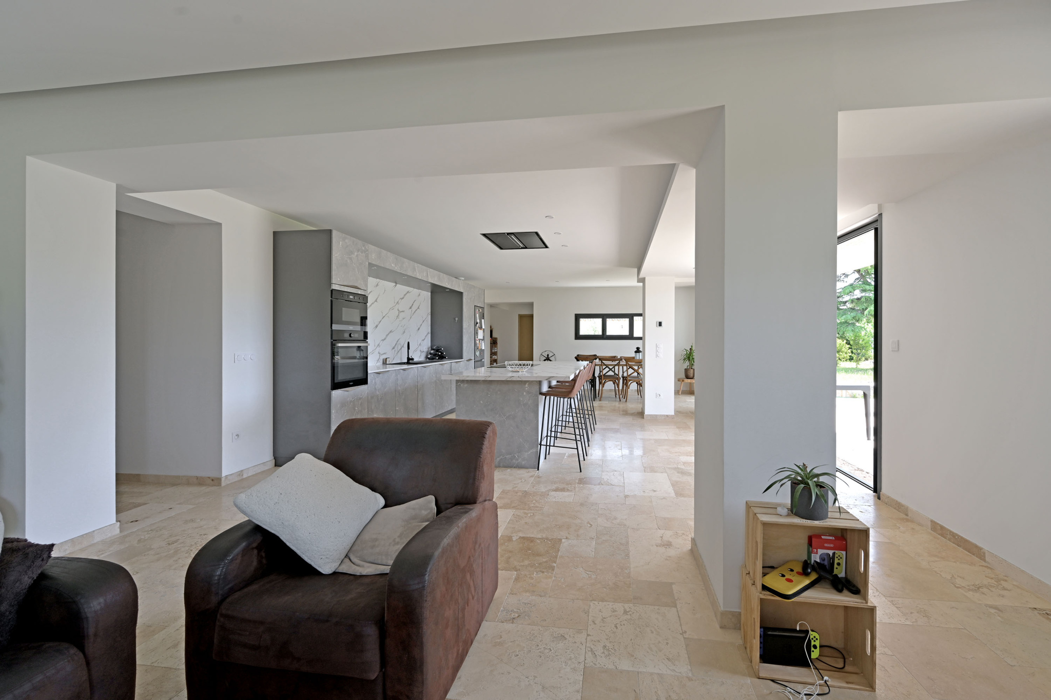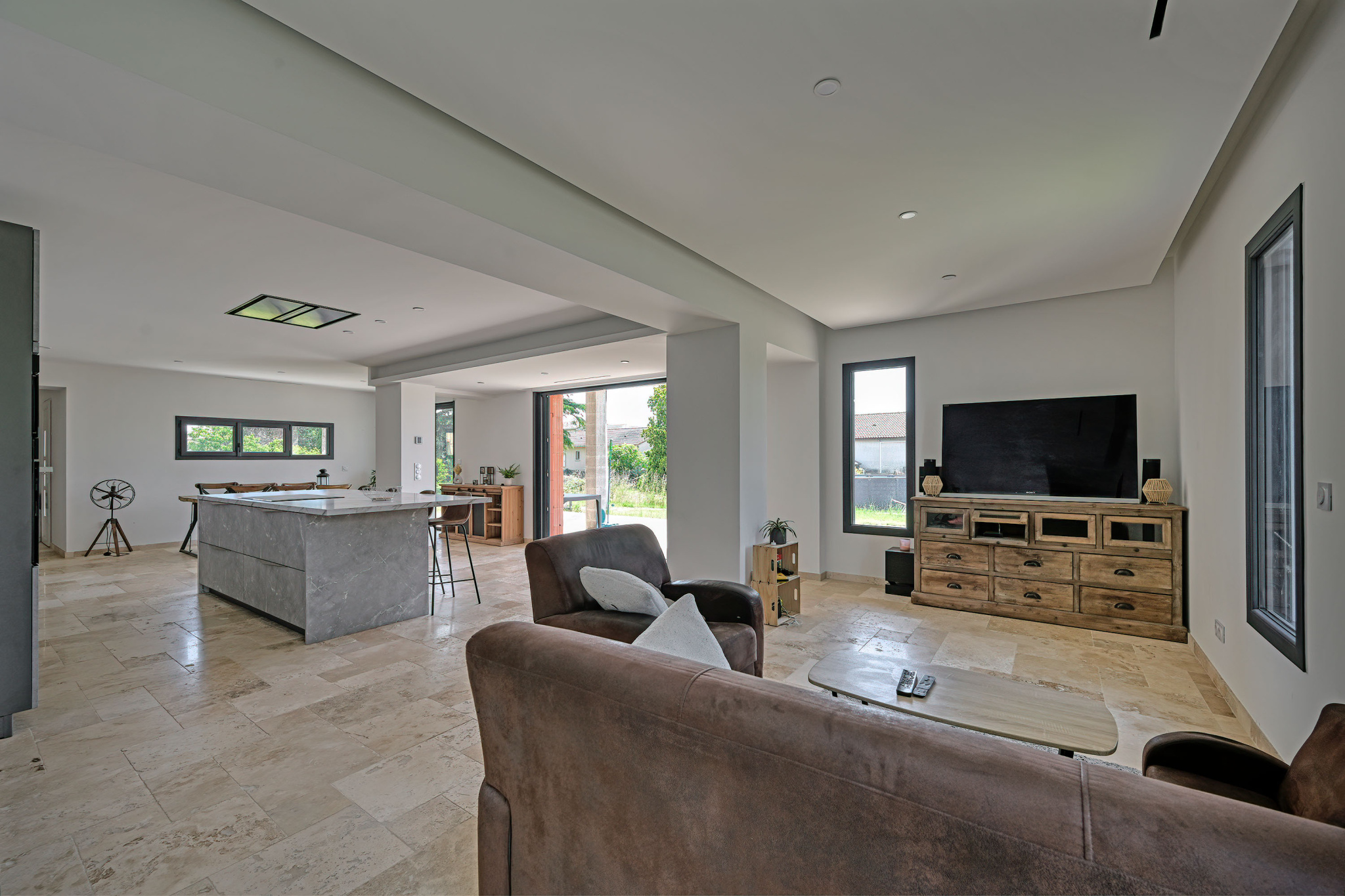 Elle se compose d'une spacieuse pièce de vie de plus de 60 m2, d'une suite parentale avec dressing et salle d'eau, de 2 chambres et leur salle de bains et d'un garage.