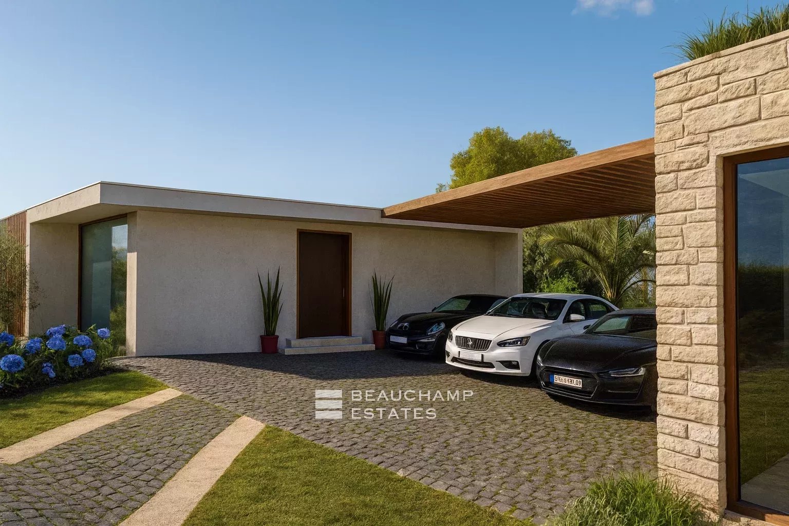 Actuellement composée d’une villa traditionnelle de 180 m² avec piscine, d’un appartement indépendant de 70 m² et d’un abri pour trois voitures, cette propriété bénéficie d’un permis de construire déjà accordé pour la réalisation d’un projet contemporain d’exception.
