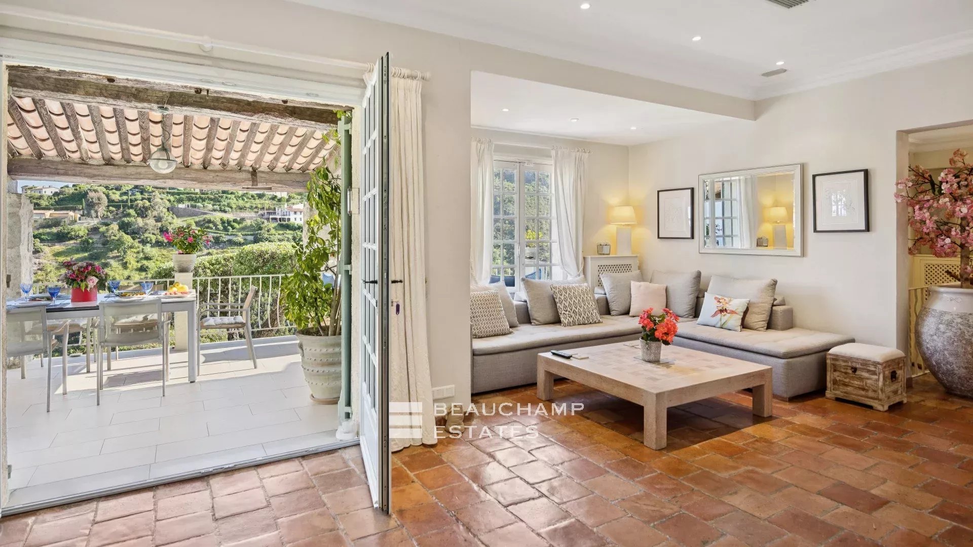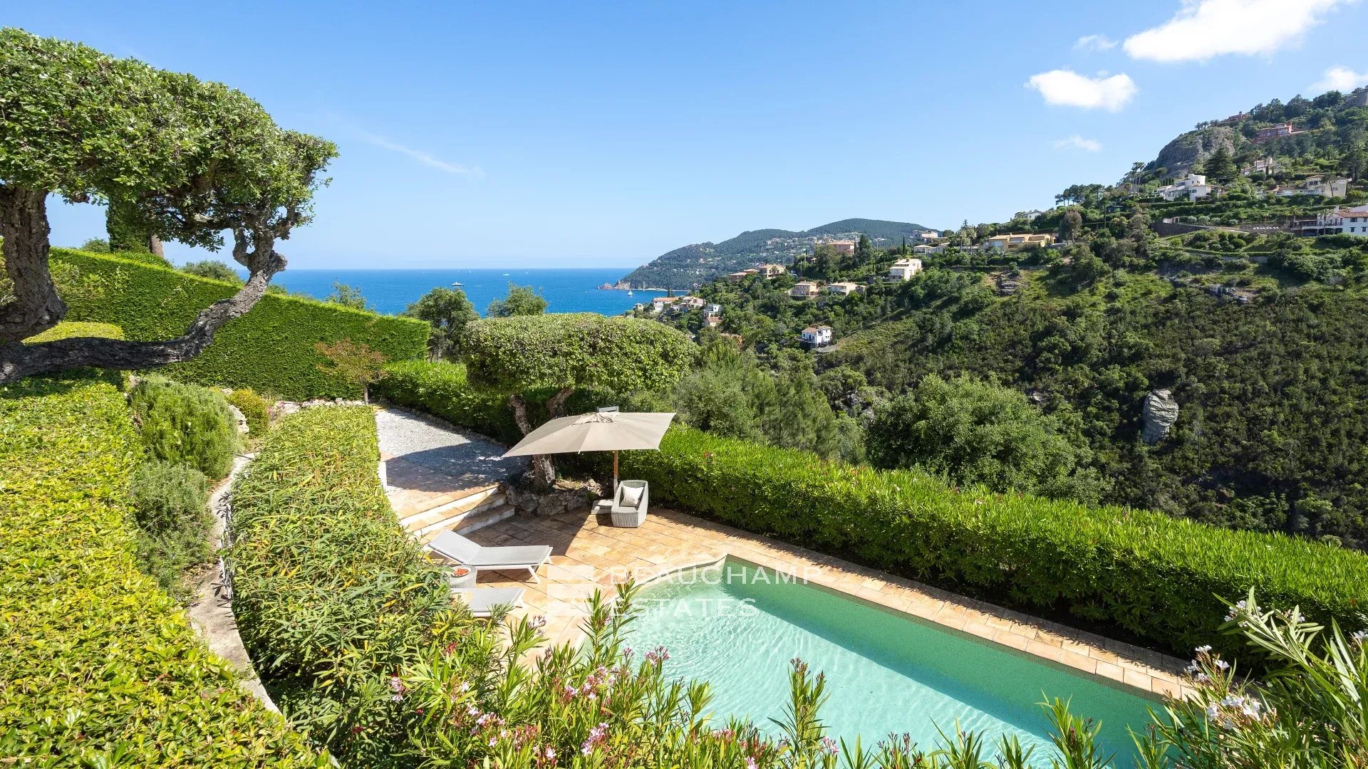 Une magnifique terrasse avec vue imprenable vous permettra de profiter pleinement de la vie en extérieur, du lever au coucher du soleil, tandis que le paysage se transforme au fil des heures sous les jeux de lumière sur les reliefs de l’Estérel.