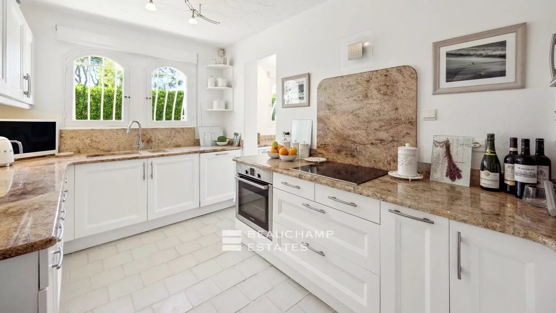 La villa se déploie sur trois niveaux et offre cinq chambres, quatre salles de bains, un salon, une cuisine équipée, une buanderie ainsi que de nombreux espaces de rangement.
