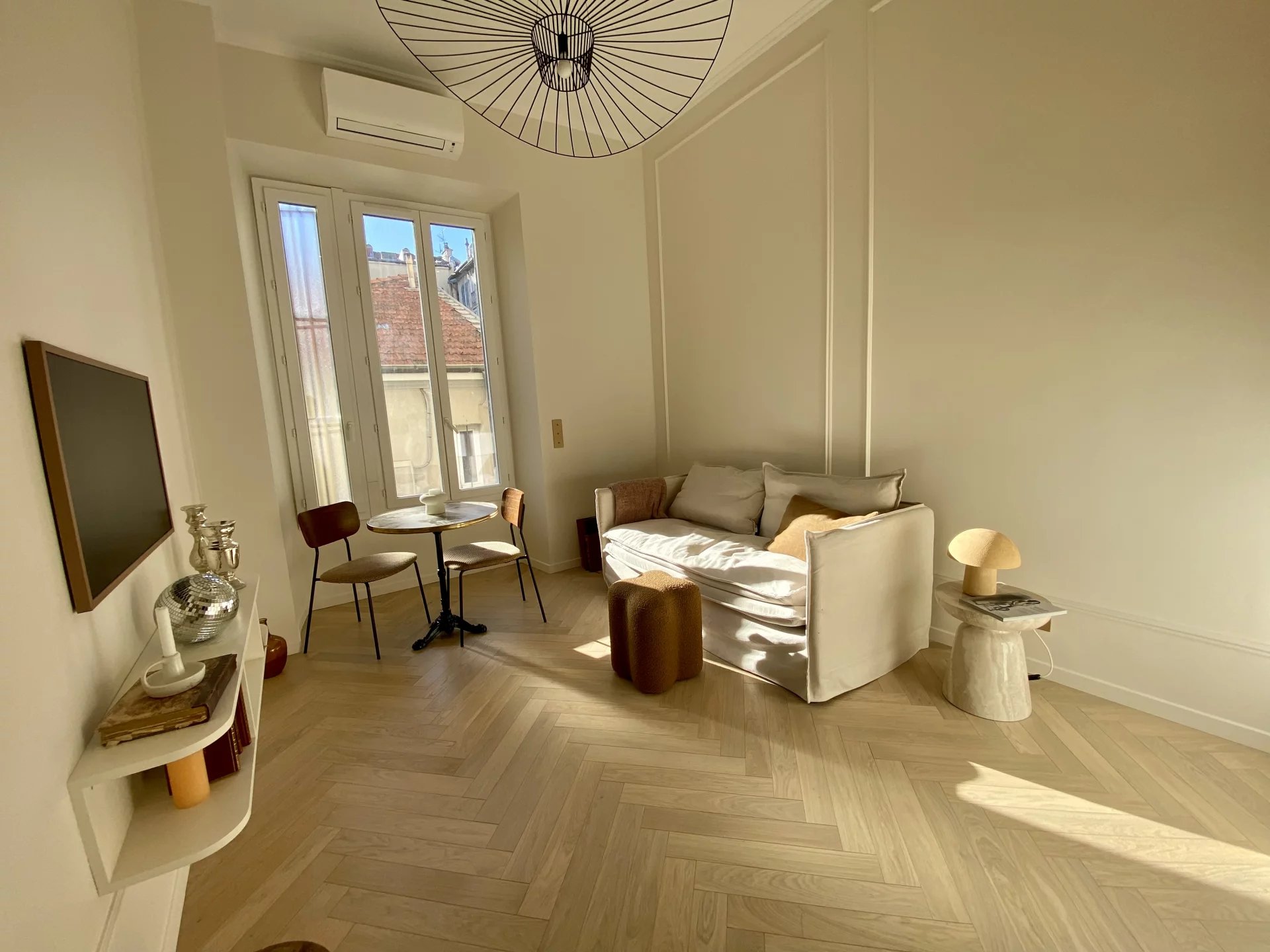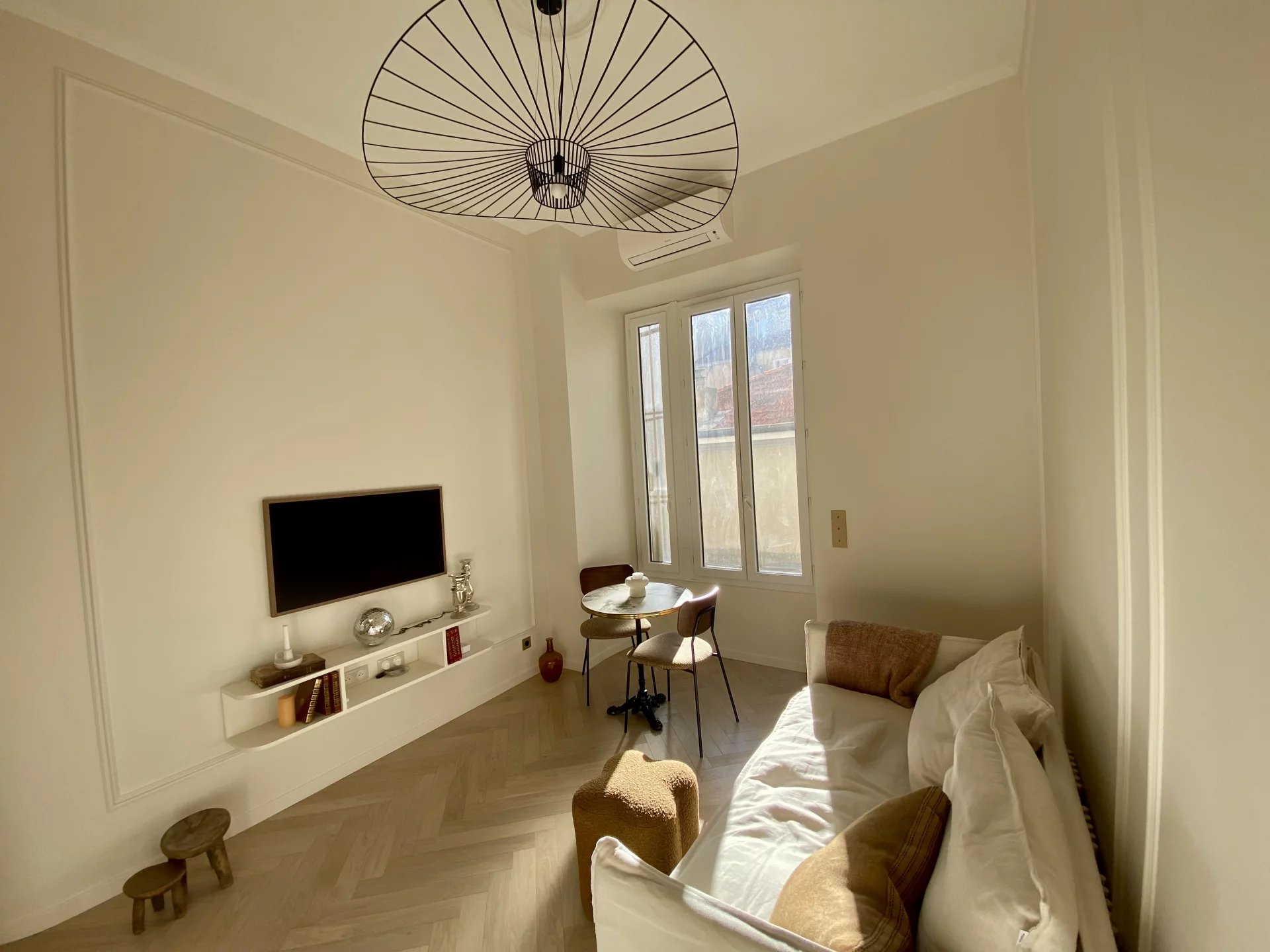 Un bijou ! Plein coeur de Nice, non loin de la mer, dans un bel immeuble ancien avec ascenseur, splendide 2 Pièces 34m2 (29m2 loi carrez) baigné de lumière, et au calme, rénové dans un style chic et raffiné par un architecte, bénéficiant de beaux volumes et de prestations haut de gamme (parquet massif, marbre, climatisation etc)