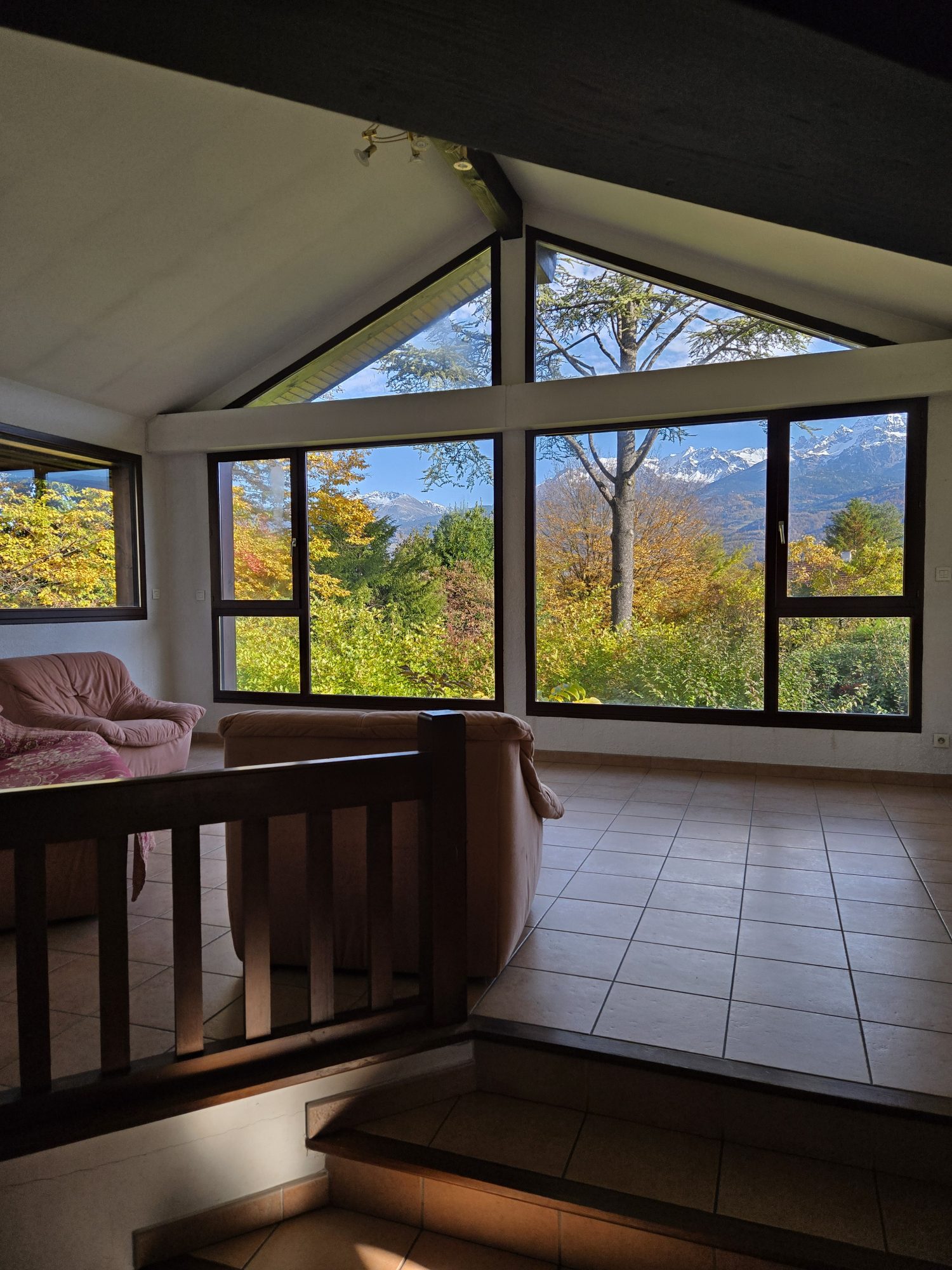 Les pièces de vie se situent au niveau principal : cuisine ouverte aménagée et équipée avec accès direct à l'extérieur, grande salle à manger cathédrale équipée d'un poêle à bois récent, salon en extension bénéficiant d'une vue dégagée sur Belledonne, trois chambres, salle de bains avec WC, buanderie et WC séparé.