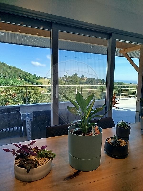 design soigné, elle s’ouvre sur de grandes baies vitrées en aluminium,