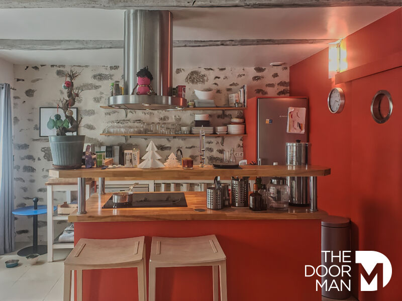 L'intérieur est composé au rez-de-chaussée d'un grand salon lumineux avec sa cuisine aménagée ouverte, d'un petit atelier et WC avec sortie indépendante côté rue. Le salon et la cuisine sont exposés sud, avec une porte d'entrée triple vitrage et vitre anti effraction. Le salon est agrémenté d'un poêle bois.