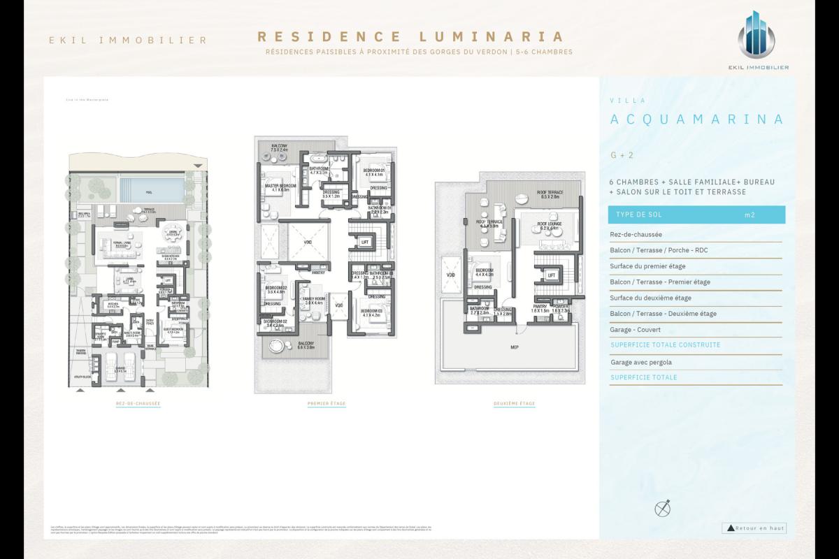 Villa "AZUR BLUE" composée de 3 niveaux : Rez-de-chaussée (RDC), un étage (R+1) et un deuxième étage (R+2).
