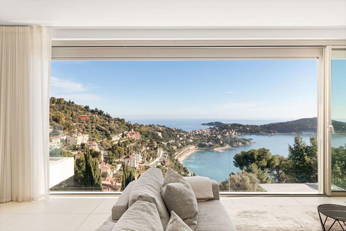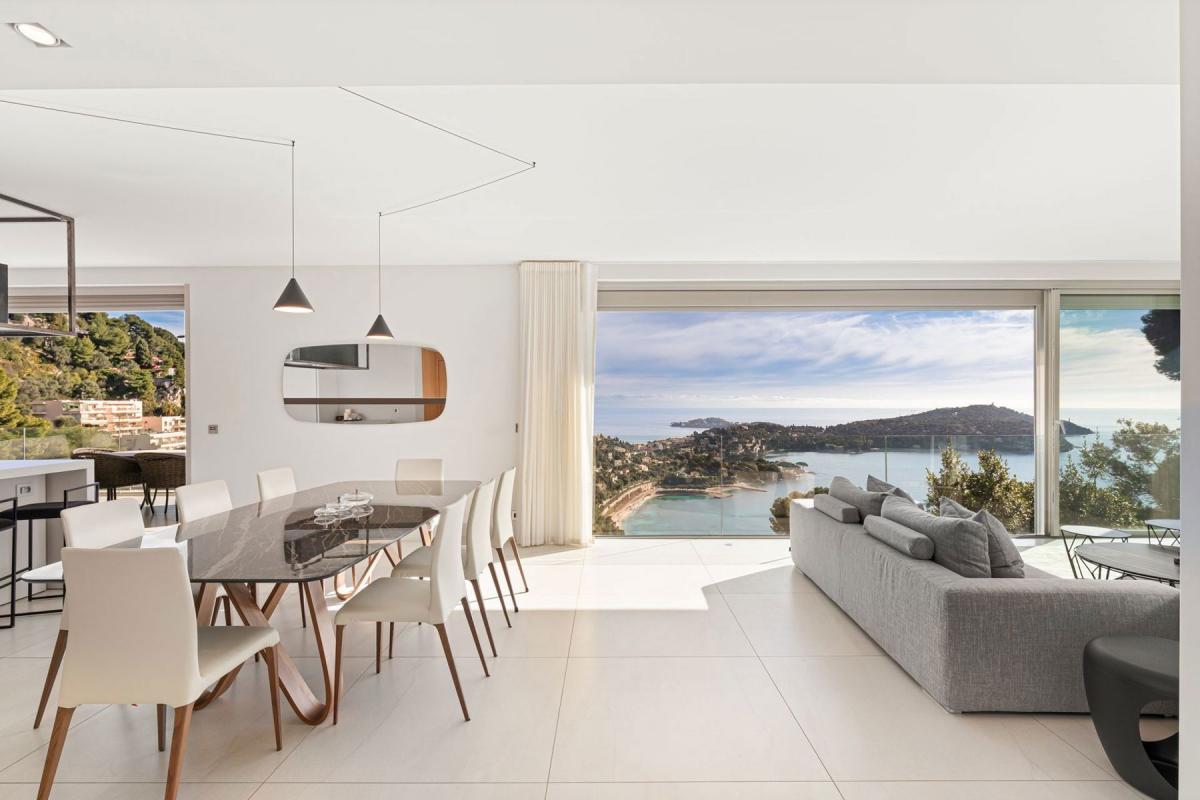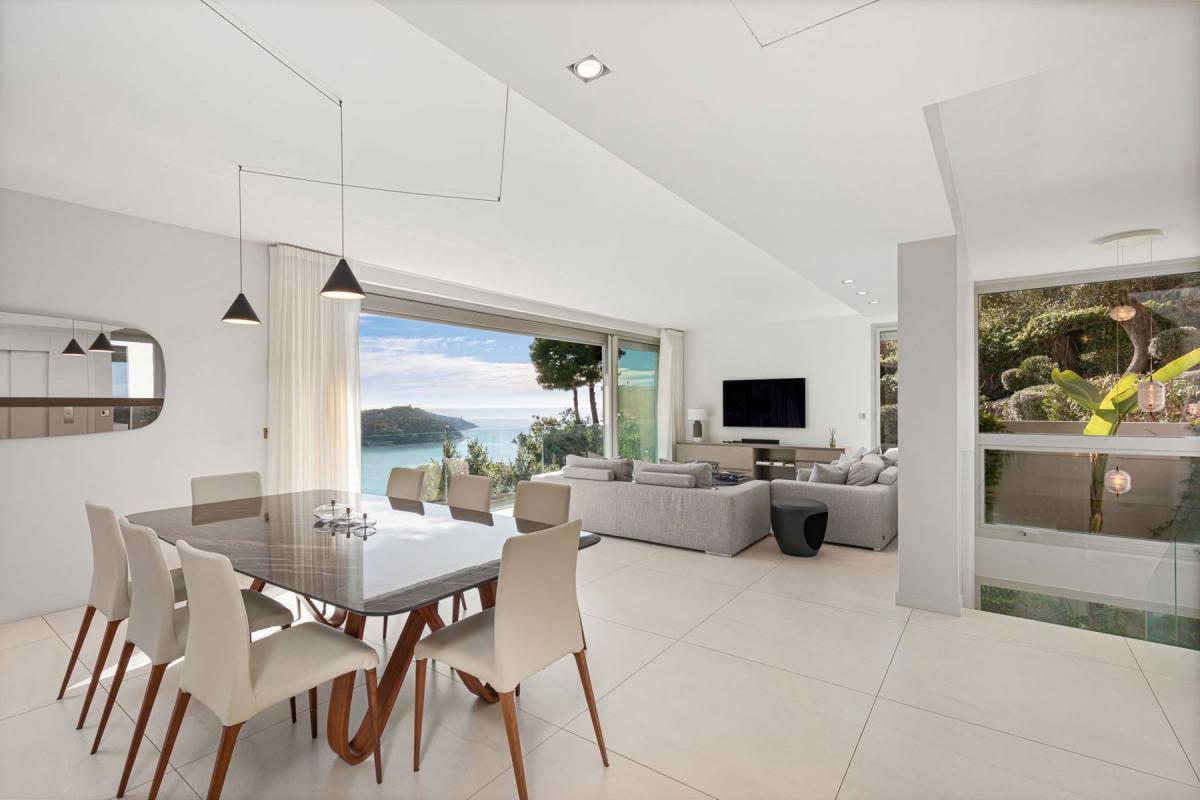 Dans un cadre idyllique, entre Monaco et Nice, à proximité de son aéroport international, découvrez une villa qui incarne à la perfection l'art de vivre méditerranéen. Nichée dans un domaine privé, en position dominante, elle offre une vue panoramique à couper le souffle sur la baie de Villefranche-sur-Mer, le mythique Cap Ferrat et les collines verdoyantes. Un décor digne d'une carte postale, de jour comme de nuit. D'inspiration californienne contemporaine, cette villa de 360 m² séduit par son élégance épurée et sa luminosité. Elle s'étend sur trois niveaux accessibles par escalier ou ascenseur intérieur. Chaque espace de vie s'ouvre sur l'extérieur, sublimant une vue imprenable. Le niveau principal accueille un vaste séjour baigné de lumière, où cuisine, salle à manger et salon prolongent l'intérieur vers une belle terrasse face à la mer. L'étage inférieur abrite un salon cosy, offrant un espace de détente, ainsi qu'une élégante suite parentale avec bureau, dressing et salle de bain raffinée, le tout ouvert sur une terrasse panoramique. Le rez-de-jardin est dédié au repos avec quatre chambres en-suite et un accès direct à l'extérieur avec sa piscine de 20 mètres de long (chauffée). Un hammam complète cet espace. L'extérieur offre un cadre agréable avec une vaste plage moderne autour de la piscine, un pool house et un jardin verdoyant sur un terrain d'environ 2000 m². Côté praticité, un appartement indépendant de 48 m² offre un confort supplémentaire, un ascenseur à voitures dessert le parking privé. La villa est également équipée d'un système de sécurité avec alarme. Idéale en résidence principale, en pied-à-terre ou en investissement locatif haut de gamme, cette propriété allie raffinement, confort et une vue exceptionnelle, tout en étant proche des commodités.
