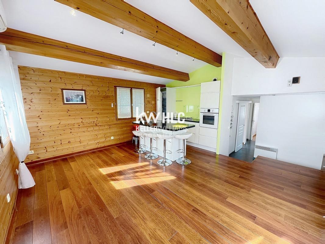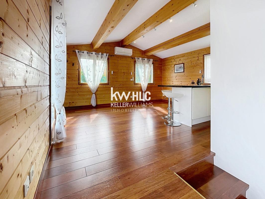 D'une surface de 59m² cette maison se compose d'une belle pièce de vie surélevée comprenant un séjour et une cuisine aménagée et équipée.