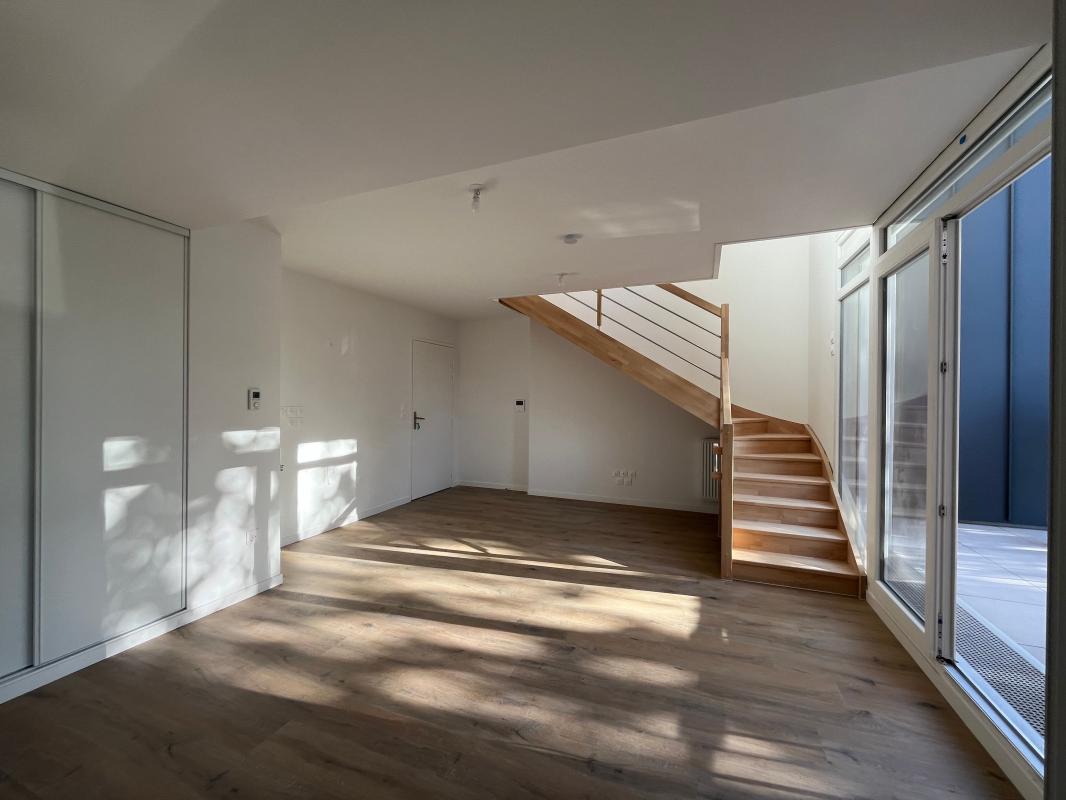 Sur le premier niveau, il comprend un séjour avec cuisine à aménager, une salle d'eau avec WC et un balcon; au niveau supérieur une chambre avec salle d'eau et WC et accès à une terrasse d'environ 35 m².