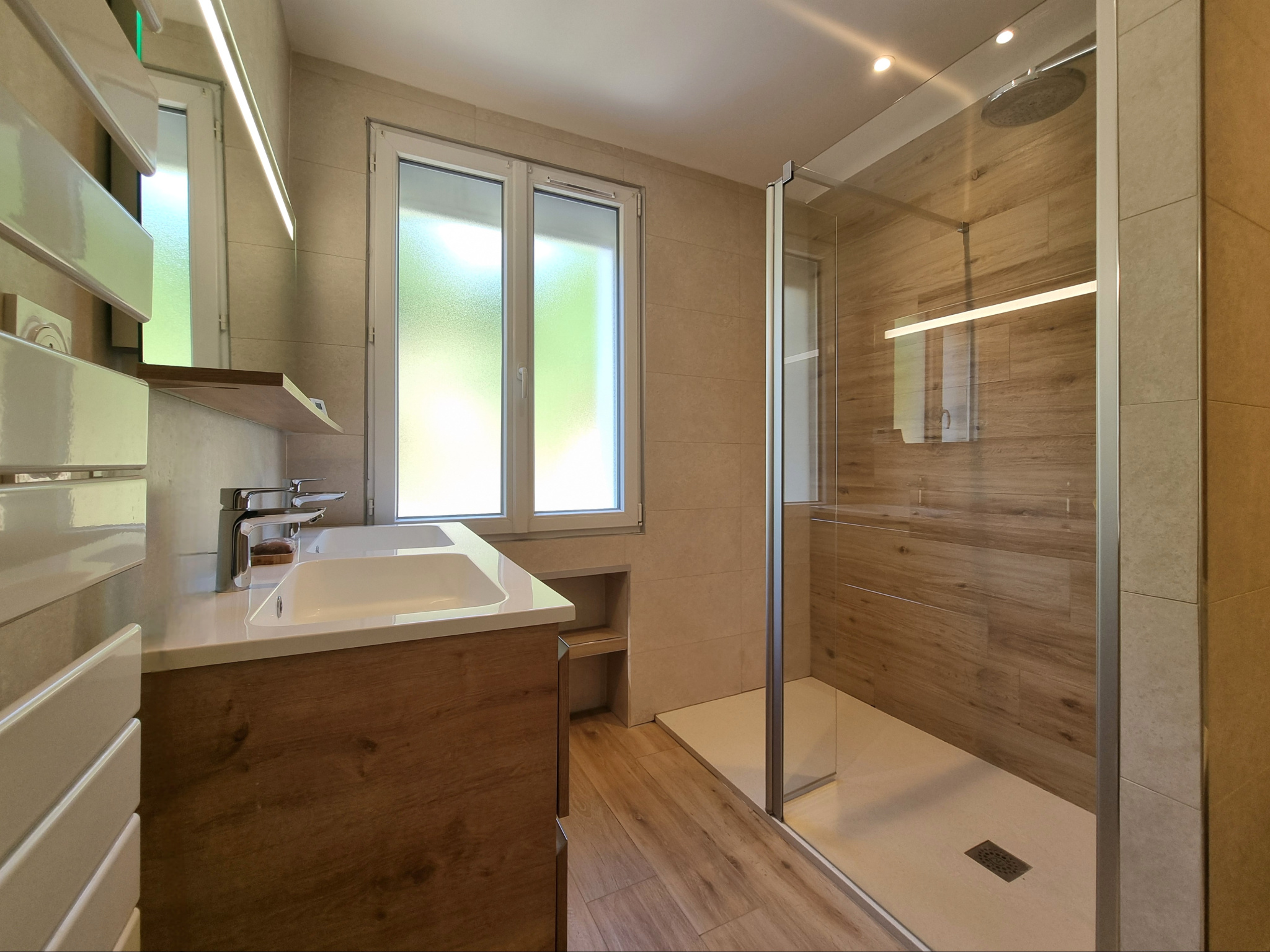 La maison est équipée d'un chauffage au gaz de ville, du double vitrage, des volets roulants électriques, et du tout-à-l'égout.
