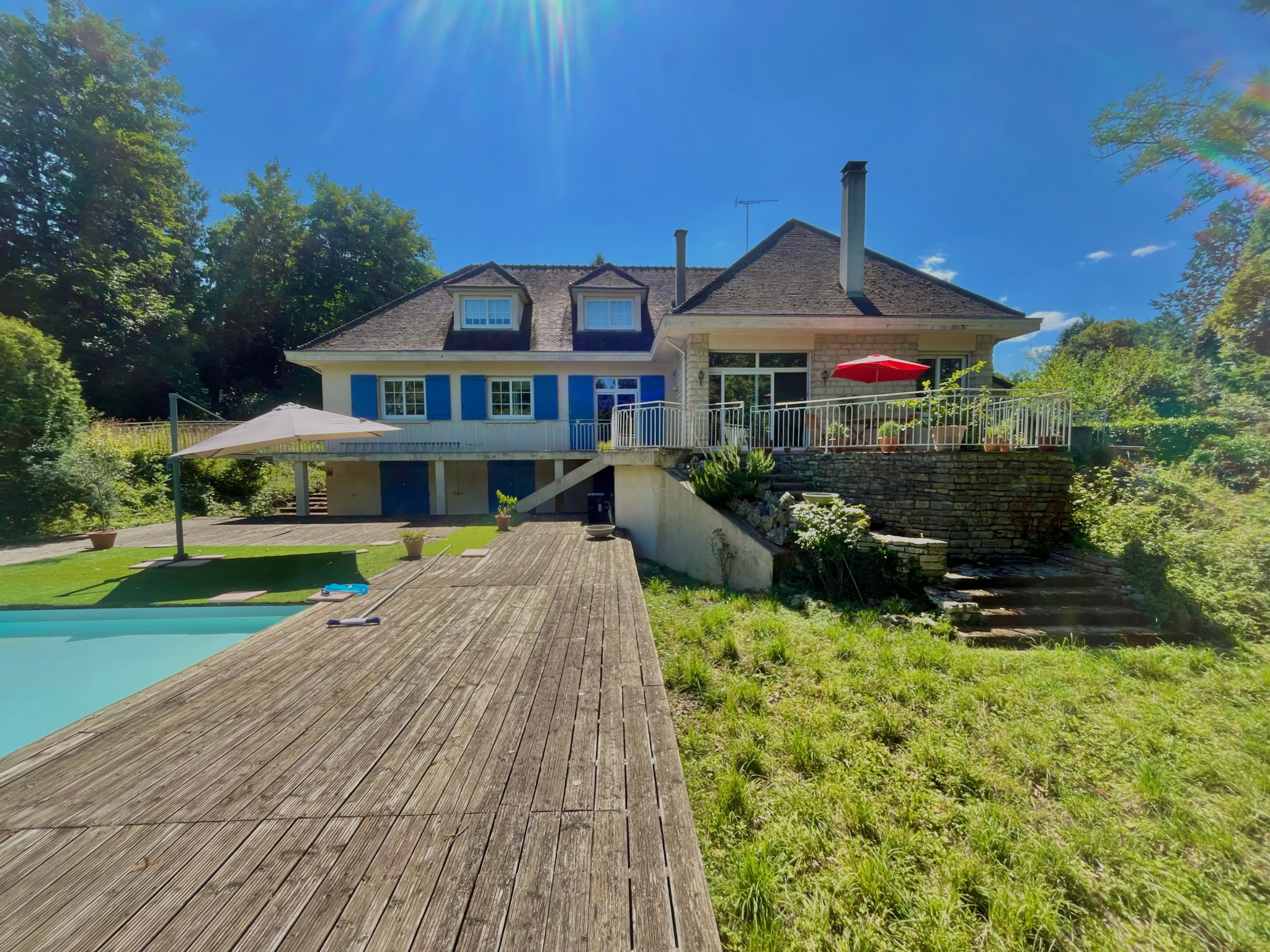 Une large terrasse entoure la maison et surplombe le terrain à l'arrière, où se niche une charmante piscine invitant à la détente. Le terrain arboré peut être partiellement ouvert pour offrir une vue dégagée sur la plaine, la ville et l'Yonne qui traverse le centre de Clamecy.