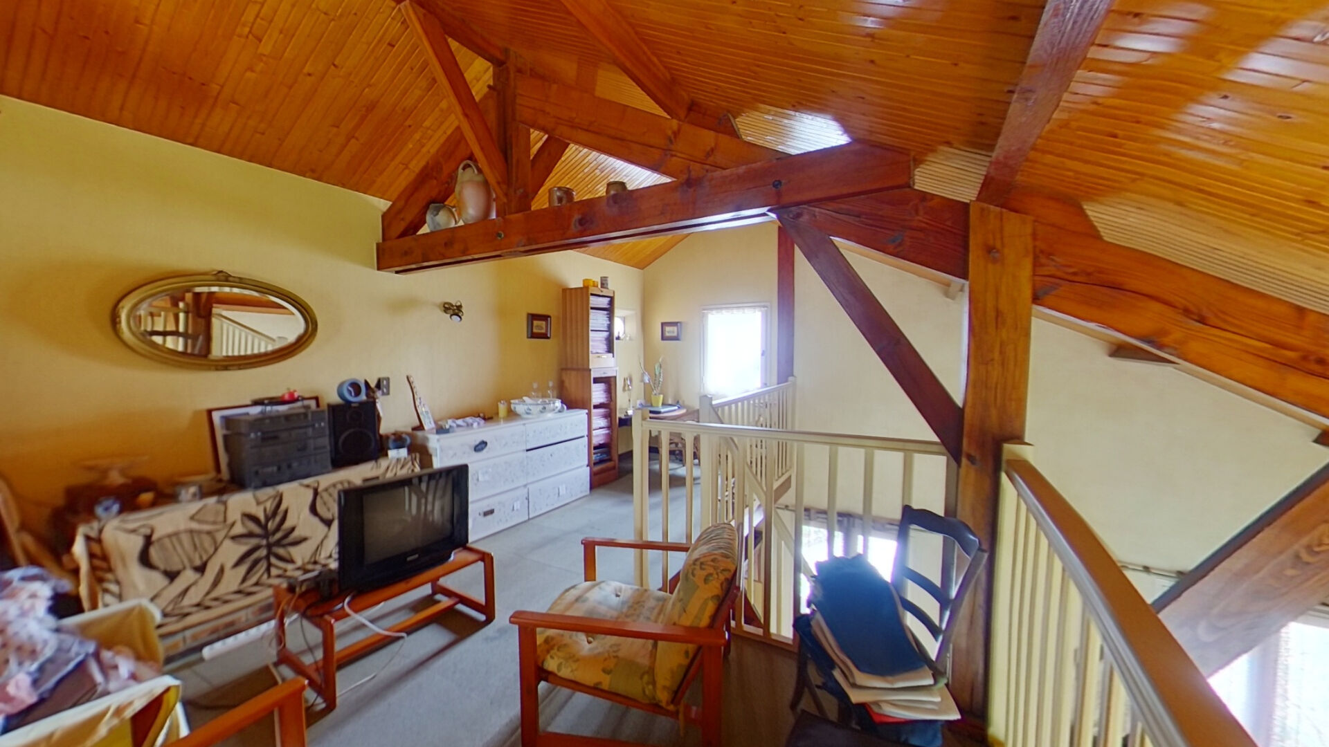 Elle se compose au rez-de-chaussée d'une entrée avec placard, d'un séjour-salon lumineux avec cheminée et mezzanine ouverte et d'une cuisine aménagée.
