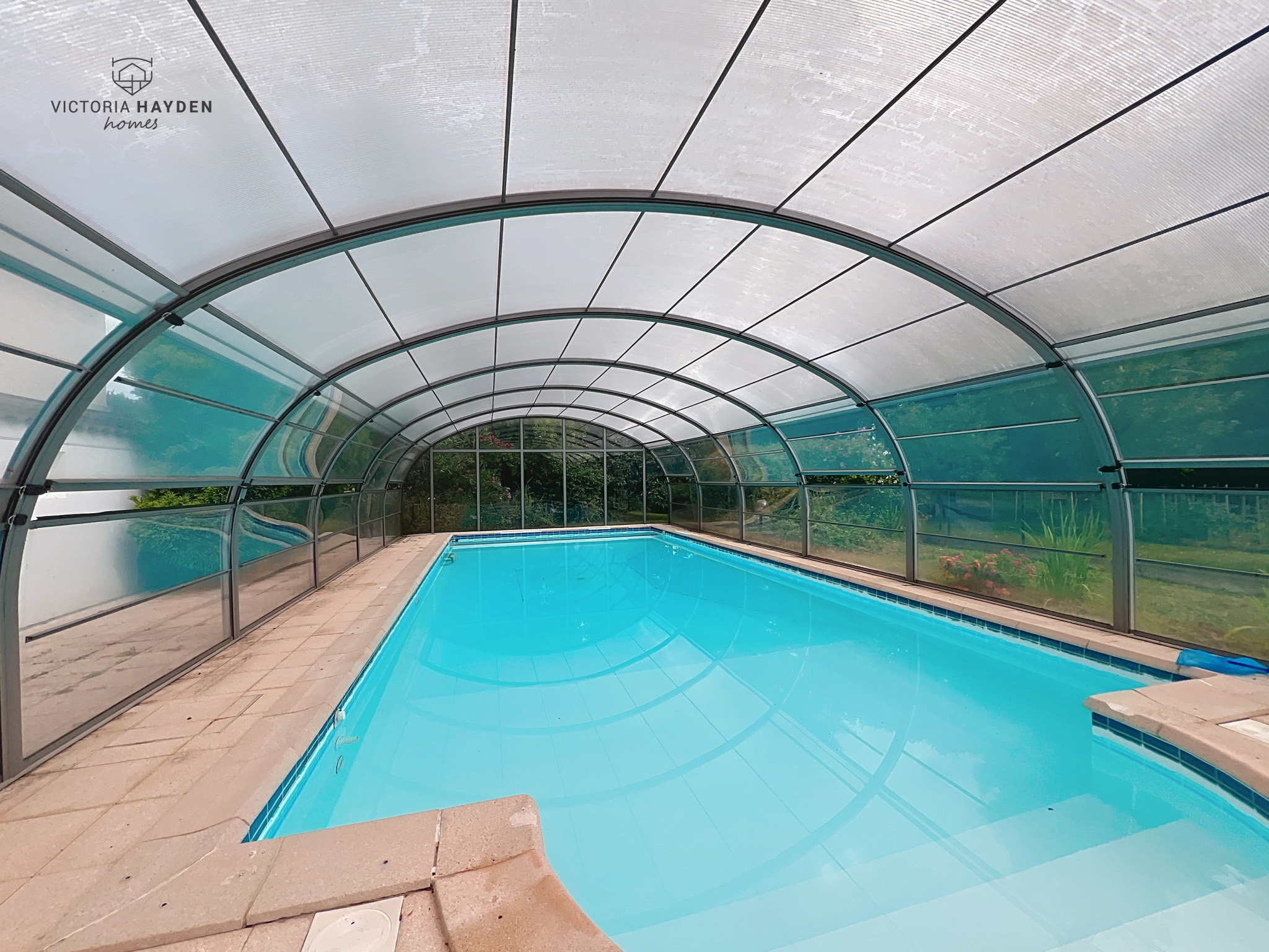 Les extérieurs sont spacieux, arboré, et équipés d'une piscine couverte, sur un terrain de 2249 m2.