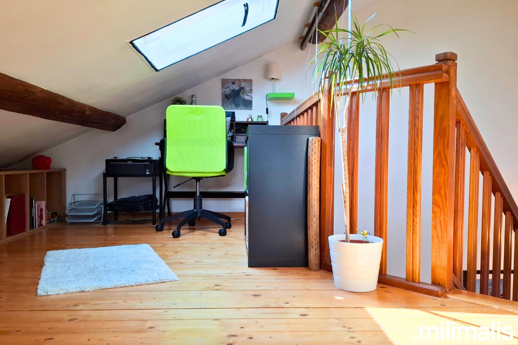 À l'étage, une mezzanine aménagée en espace bureau, une salle de bains et une seconde chambre complètent le bien.